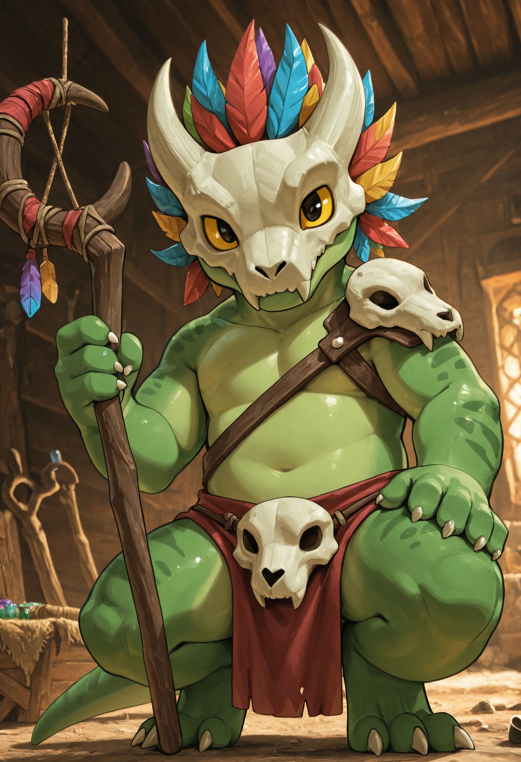Illustrious: best quality, amazing quality, very aesthetic, absurdres, newest, w1tch_d0ct0r, solo, 1boy, anthro, bara, furry male, furry, thick thighs, yellow sclera, scaly, claws, skull, seductive, ...your tags...