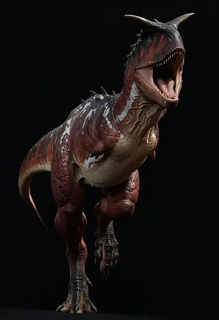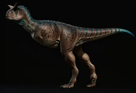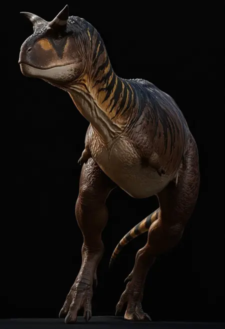 The skeleton, preserved with skin impressions, reveals a covering of small, granular scales interspersed with rows of elongated osteoderms—suggesting a body adapted for speed and endurance. Its long, muscular legs indicate that Carnotaurus was likely one of the fastest theropods of its time, perhaps capable of short, explosive sprints.