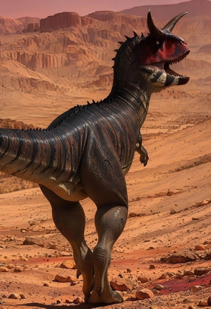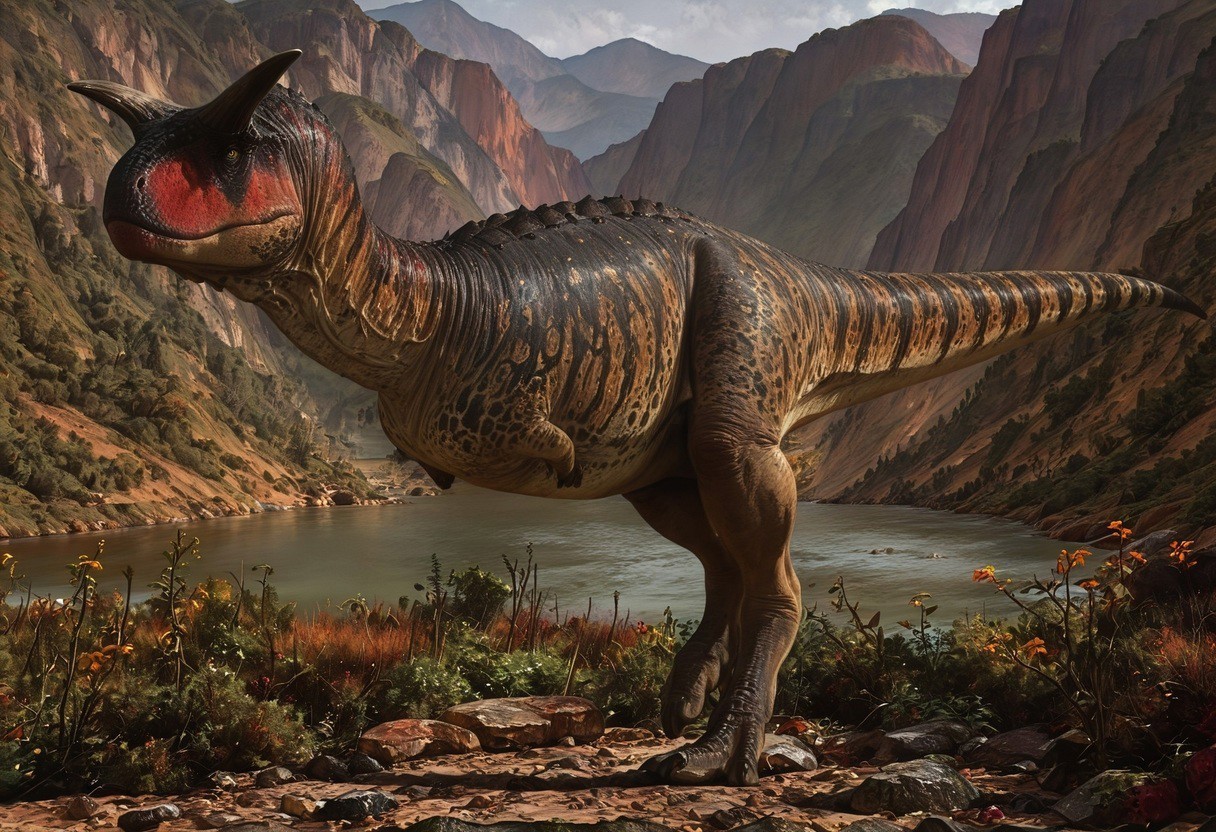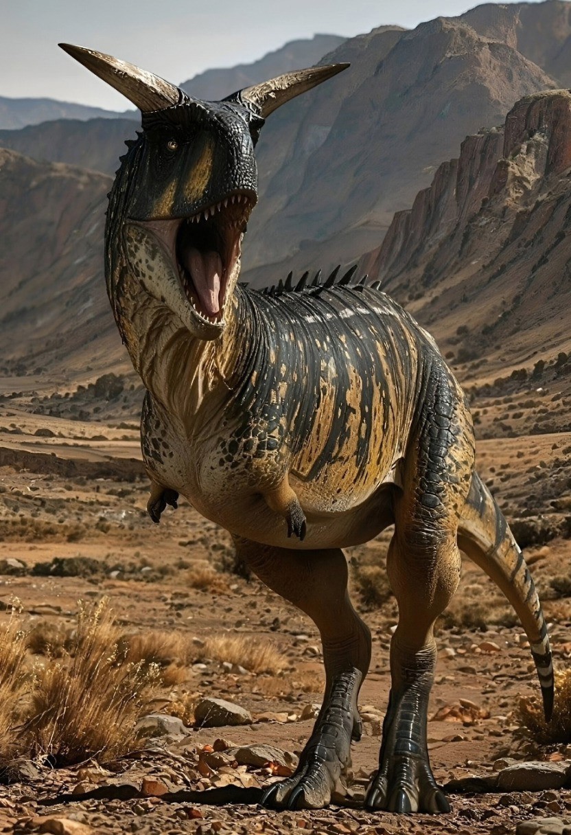 Carnotaurus — The “Carnivorous Bull” of Patagonia Carnotaurus sastrei was a large carnivorous theropod from the late Cretaceous period in Patagonia. Measuring approximately 7.5 to 8 meters in length and with an extremely light body for its size, it was one of the most specialized predators in South America. Its short, deep skull, marked by two thick horns above its eyes, gave it a unique appearance among carnivorous dinosaurs.
