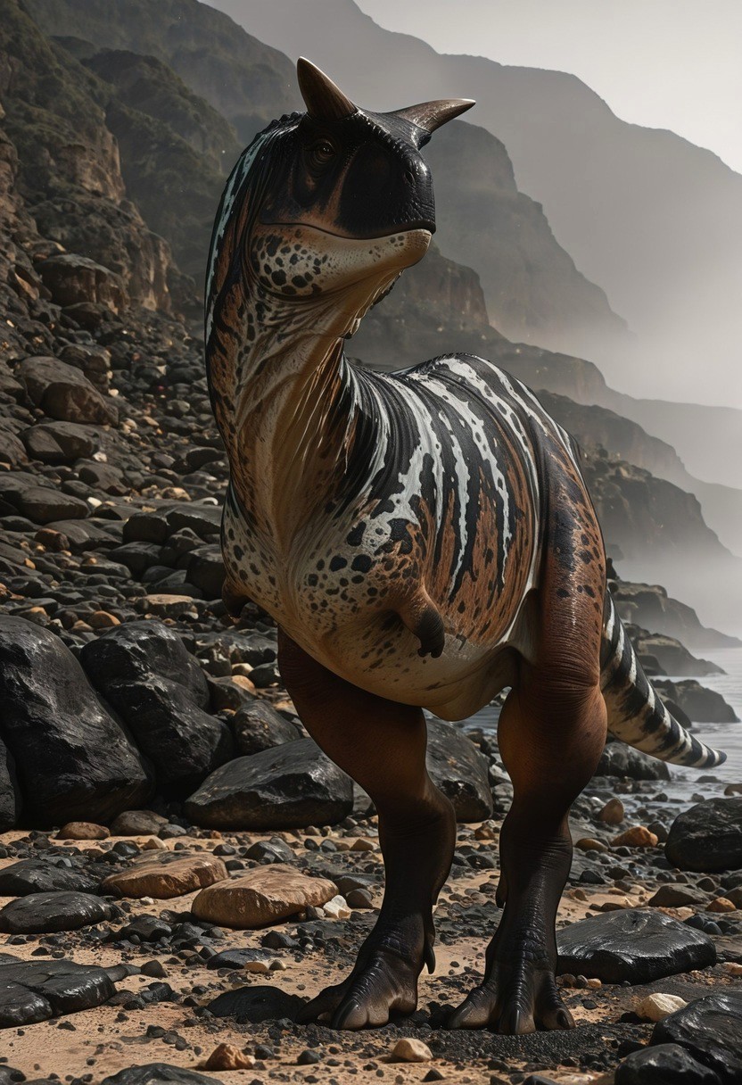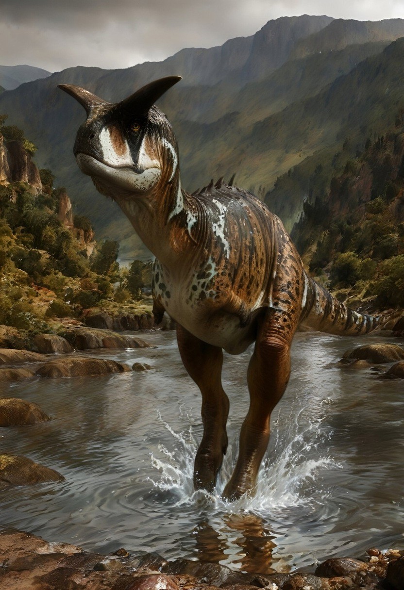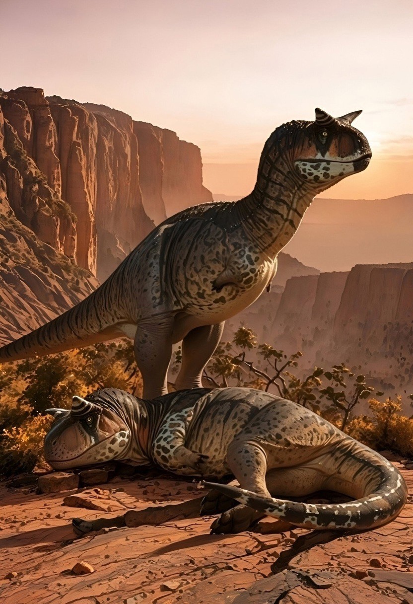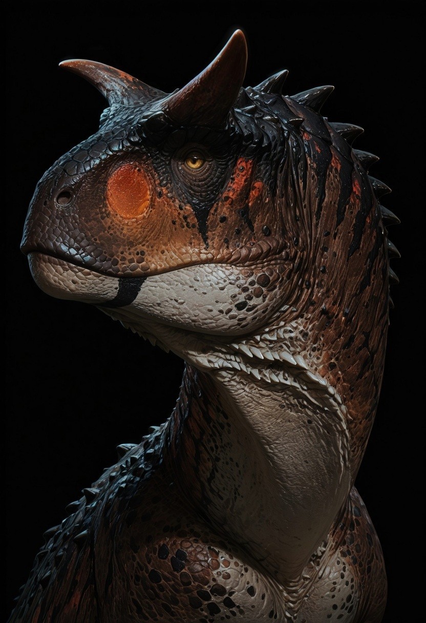 Carnotaurus — The “Carnivorous Bull” of Patagonia Carnotaurus sastrei was a large carnivorous theropod from the late Cretaceous period in Patagonia. Measuring approximately 7.5 to 8 meters in length and with an extremely light body for its size, it was one of the most specialized predators in South America. Its short, deep skull, marked by two thick horns above its eyes, gave it a unique appearance among carnivorous dinosaurs.