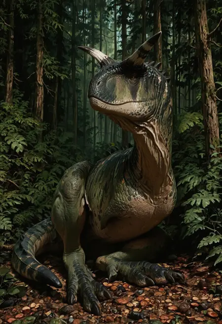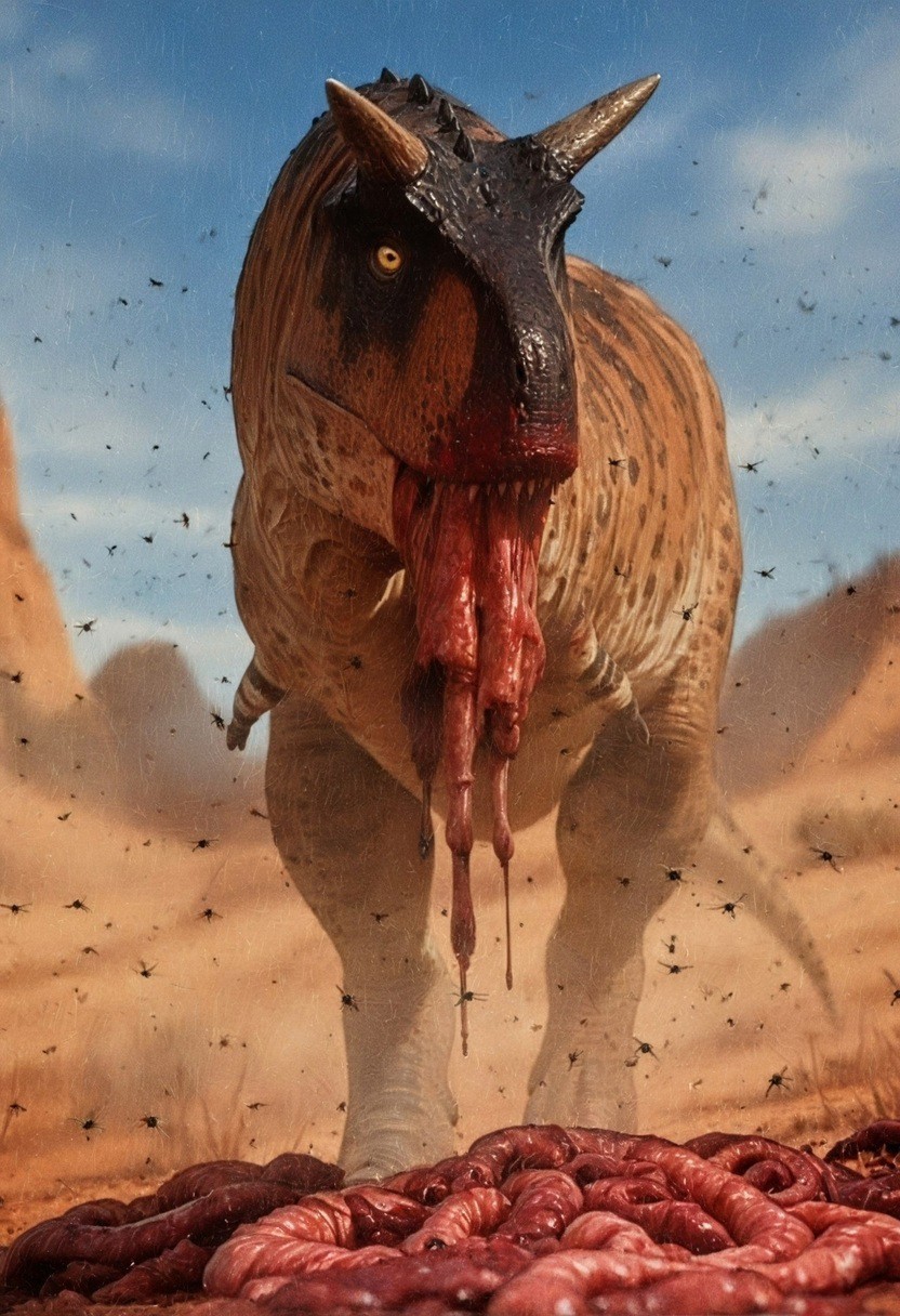 Its tiny arms, even smaller than those of a T. rex, were vestigial, but its robust neck and light jaw suggest an attack strategy based on quick strikes, efficiently grabbing and tearing flesh. Inhabiting coastal plains, open forests, and areas near estuaries, it likely hunted medium-sized herbivorous dinosaurs, competing with other abelisaurids and large crocodilians.