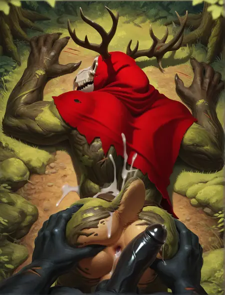 태그: l3sh3n, 두개골 얼굴, 수염, 괴물, 생물, 발톱, 긴 손가락, 나무껍질 피부, 찢어진 옷, 키가 크다, 사슴 두개골, 잎, 이끼, 후드, 치마, 찢어진 옷, 가지