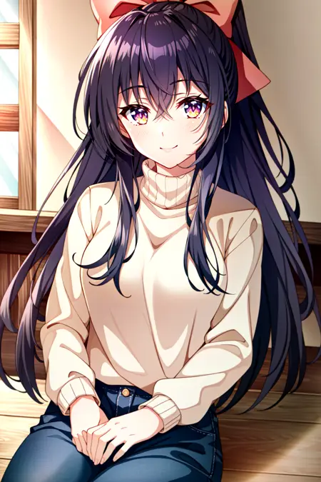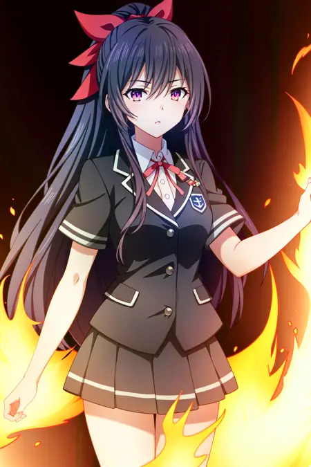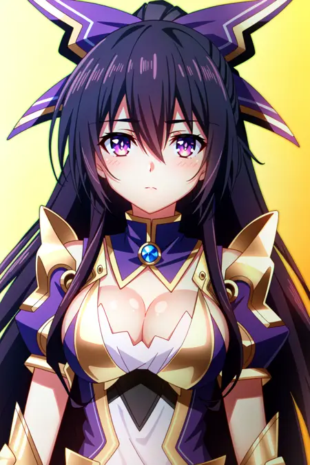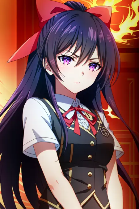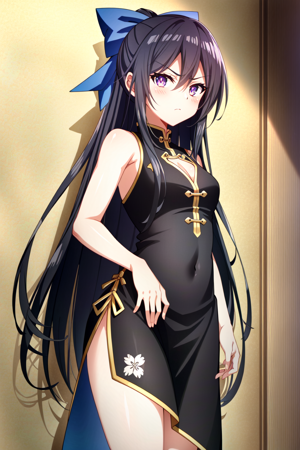 Tenka Yatogami, gradient eyes, purple and yellow eyes, long hair, ponytail ribbon, hair ribbon, purple hair, collarbone, black hair, serious