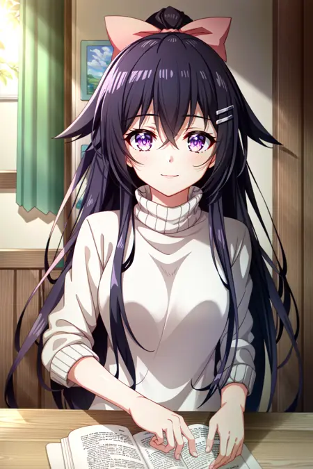 十香のトリガー:夜刀神十香、グラデーションの瞳、紫と黄色の瞳、長い髪、ポニーテールのリボン、髪のリボン、紫の髪、鎖骨、黒髪、真剣な表情