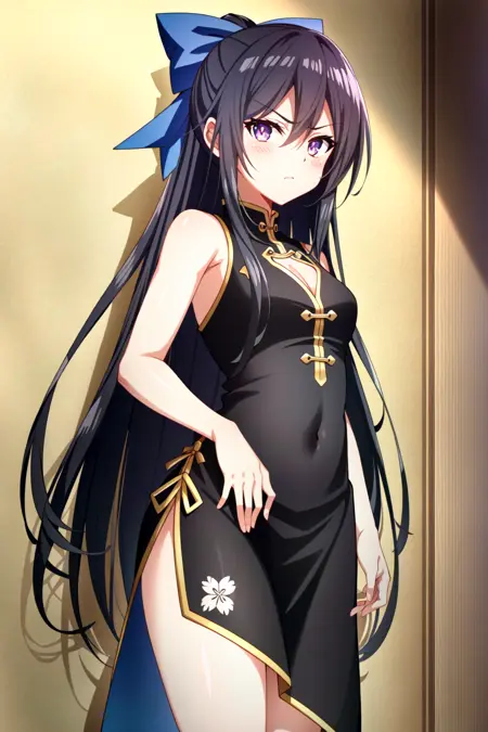 夜刀神十香の衣装 2:へそ、手袋、中程度の胸、thighhighs、アーマー、ブーツ、乳首、黒いエルボーグローブ、黒い手袋、髪のリボン、弓、非常に長い髪、黒いthighhighs、透け感、アーマードレス、ショー Girl スカート