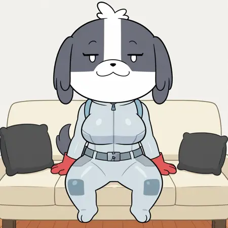 dog, dog girl, shih tzu, black and white fur, white eyes, black nose, dog ears, dog tail,