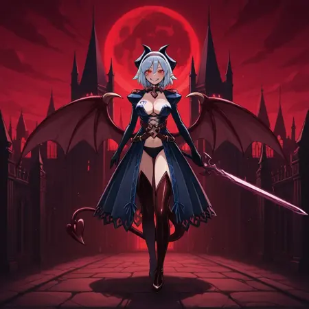 succubuswilmarina, succubus, demon girl, demon horns, demon wings, demon tail, hair between eyes, sidelocks, short hair, red eyes, tattoo, face tattoo, breast tattoo, dark hairband, pointy ears, cape clasp, cleavage, navel, juliet sleeves, black gloves, crossed belts, black skirt, black thighhighs, thigh boots, high heels, purple sword