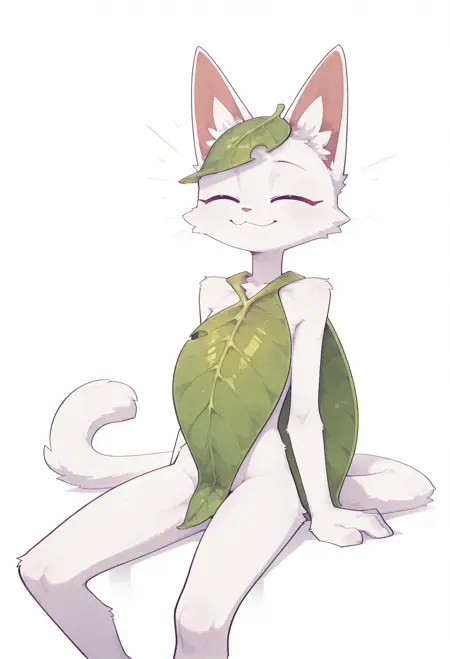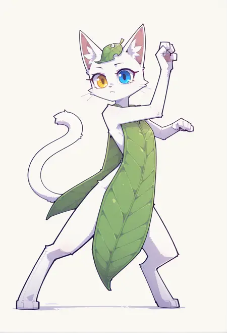 보조 태그: 고양이, 흰 고양이, 흰 털, 이채동색, 노란 눈, 파란 눈, 머리 위 잎, 가슴 위 큰 잎, 등 위 큰 잎, 두 개의 잎으로 이루어진 옷