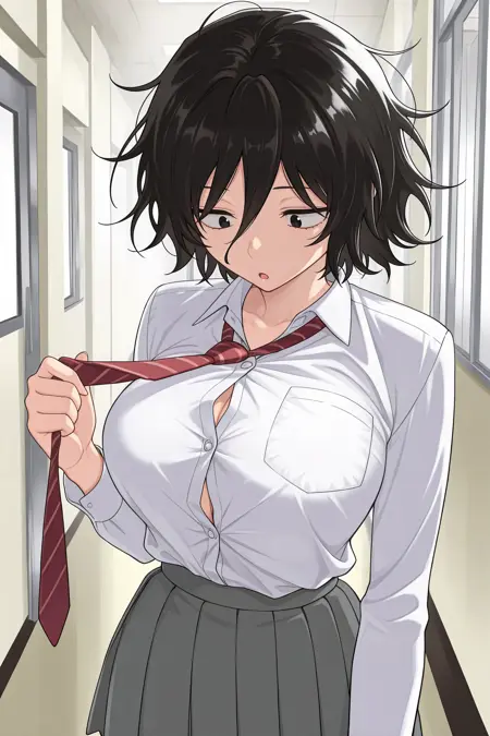 Add "white shirt, collared shirt, long sleeves, red necktie, striped necktie, shirt tucked in, grey skirt, pleated skirt, black socks, kneehighs, loafers" for her typical look.