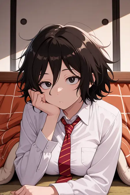 Trigger word is "asai" and "black hair, short hair, messy hair, hair between eyes, black eyes" is required.