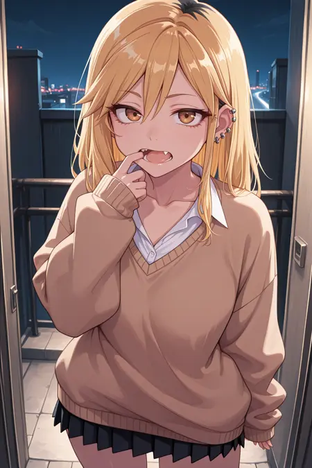 为呈现她的典型造型,请添加 "耳环、耳洞、浅棕色毛衣、长袖、袖子超过手腕、白衬衫、有领衬衫、锁骨、黑色短裙、迷你裙、百褶裙、黑色袜子、及膝袜、乐福鞋"。