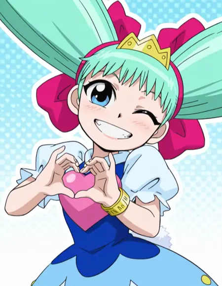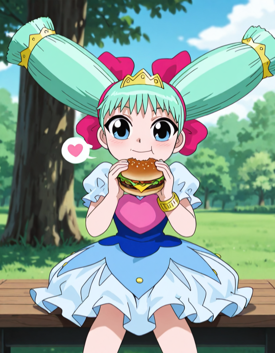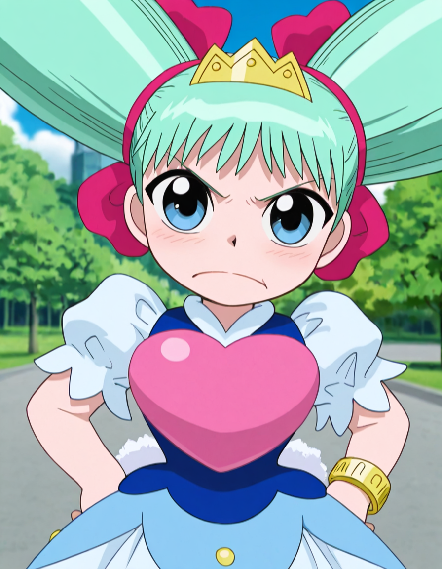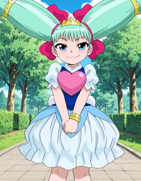 학습 프롬프트: patiechan, 트윈테일, 튜브 헤어, 높은 트윈테일, 녹색 머리, 파란 눈, 작은 왕관, 머리 리본, 팔찌, 드레스, 하트, 퍼프 슬리브
