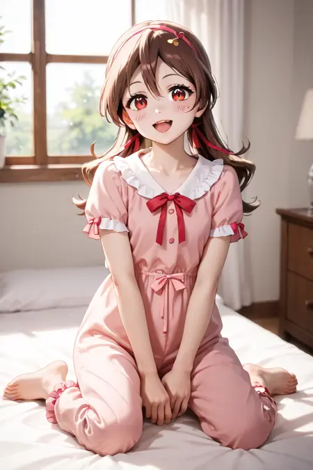 uta, 1girl, 싱글, 긴 머리, 갈색 머리카락, 긴 소매, 빨간 눈, 눈 사이 머리카락, 쇄골, 프릴, 흰색 프릴, 머리 풀어놓음, 잠옷, 침실, 날카로운 선, 수면복, 분홍 잠옷, 리본, 베개, 분홍 바지, 벌거벗은 발, 시청자 바라보기,