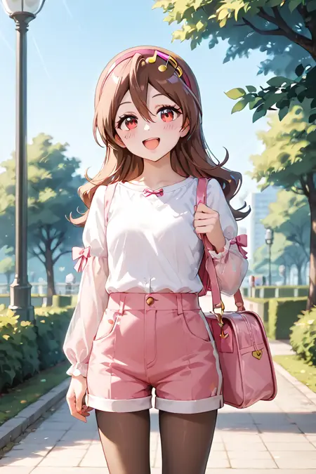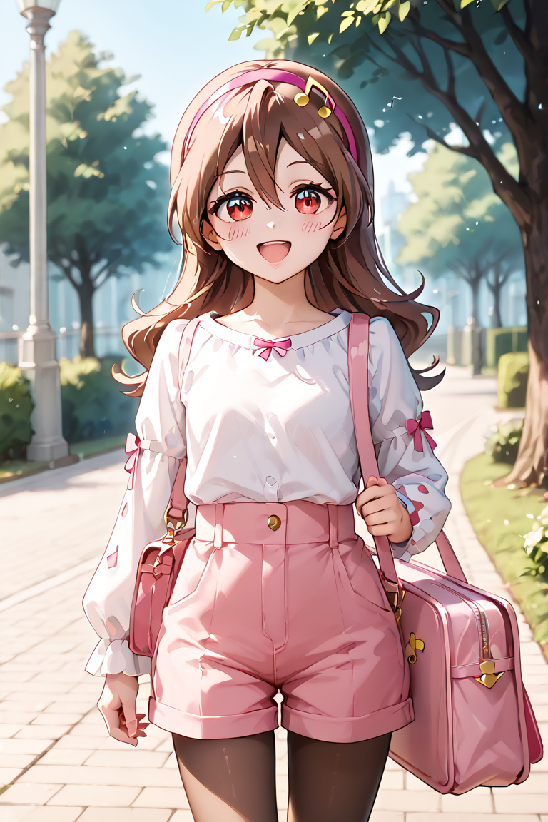 uta, 1girl, 싱글, 긴 머리, 갈색 머리카락, 긴 소매, 머리 장식, 빨간 눈, 눈 사이 머리카락, 흰색 셔츠, 짧은 소매, 헤어밴드, 가방, 음표, 8분음표, 층층이 소매, 분홍 헤어밴드, 음표 머리 장식, 분홍 가방, 분홍 반바지, 반바지 아래 팬티스타킹, 서 있음, 시청자 바라보기,