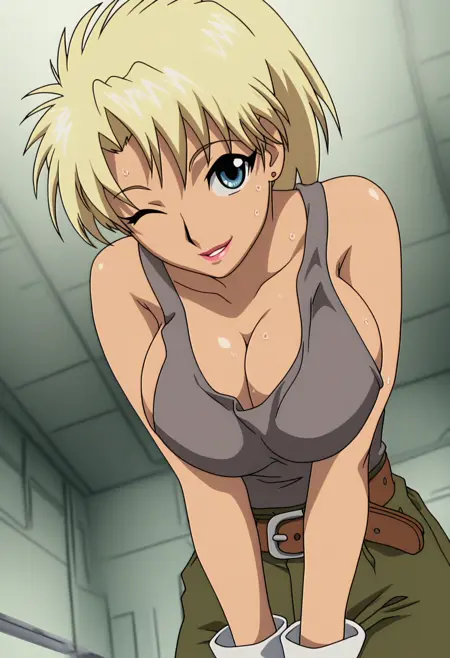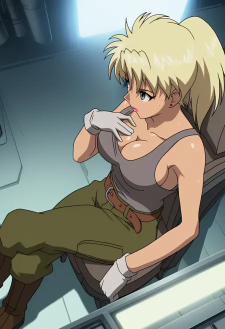 ポニーテール、グレーのタンクトップ、胸元、ベルト、緑のズボン、