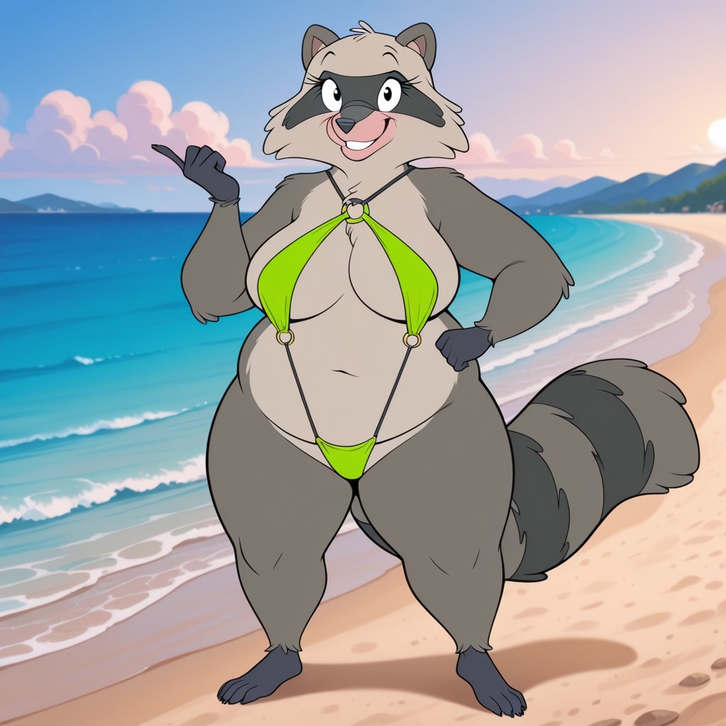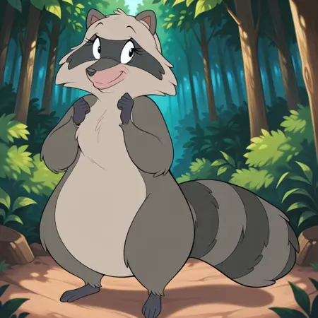 raccoon, raccoon girl, gray and black fur, pink snout, black eyes, black nose, raccoon ears, black hands, black feet, raccoon tail,