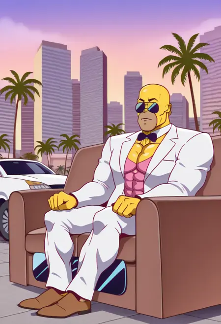 homer_simpson, bald, white suit, sunglasses, white pants, shirt, 1boy
