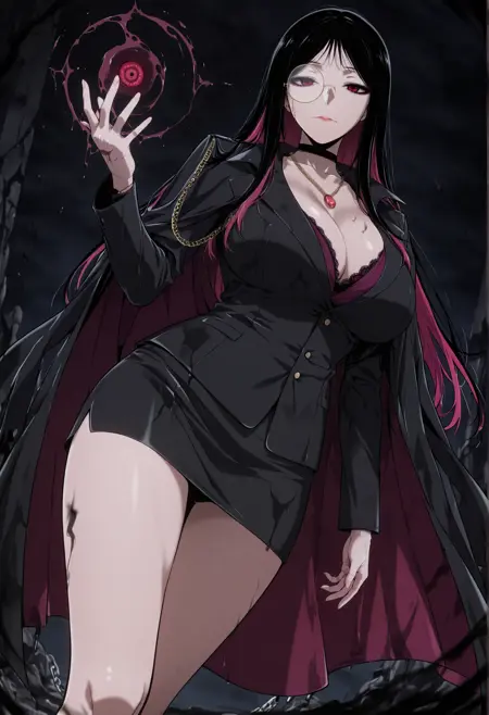 1girl,Boiling_Abyss_(the cold blooded warrior),two-tone hair, black hair, pink streaks hair, long hair, straight hair, bangs hair,red eyes,sharp eyes,half-lidded eyes,big breast, slim waist, long legs,