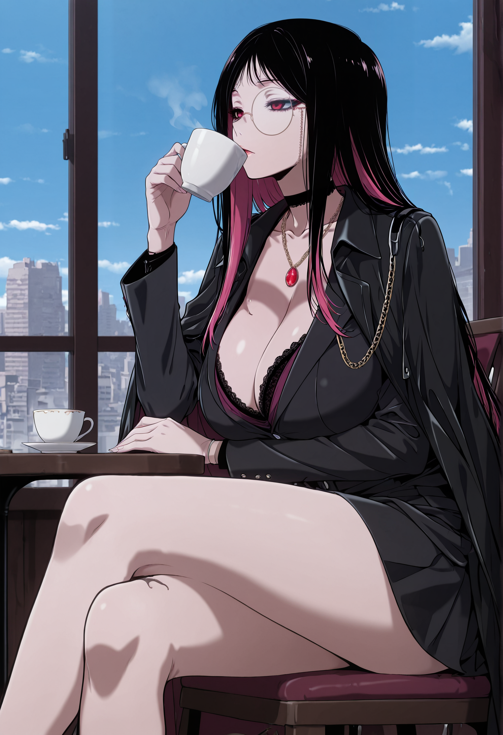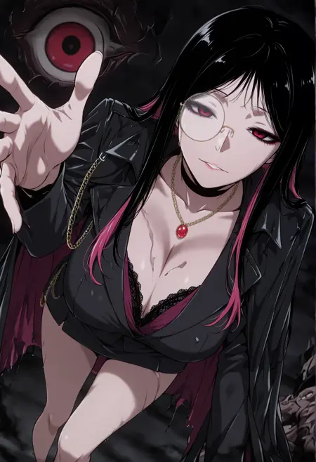 shoulder cape jacket, black blazer, lace bra trim, long sleeves, black mini skirt,chain accessory,monocle with chain, plain choker, red gemstone necklace, gold chain necklace,