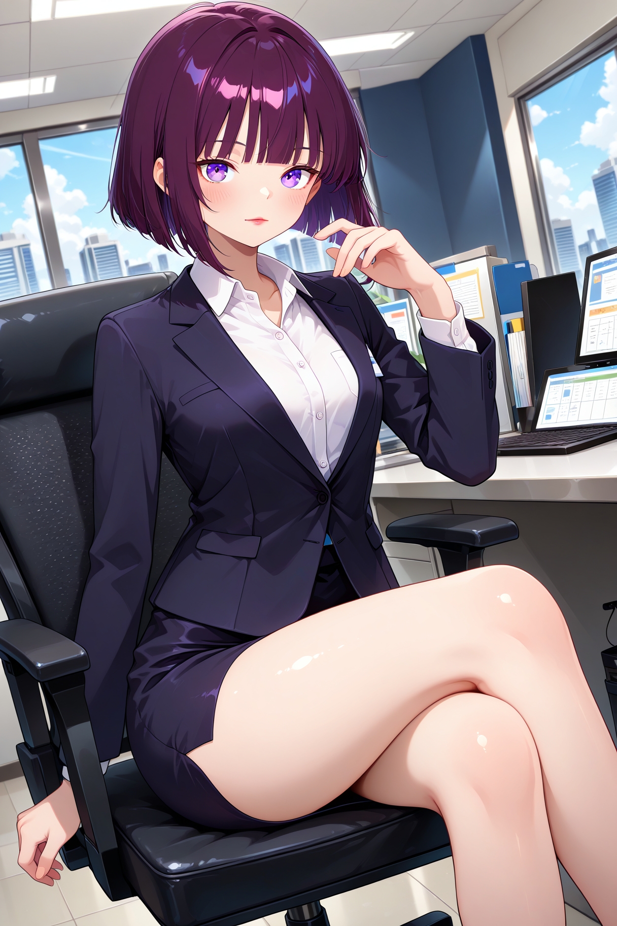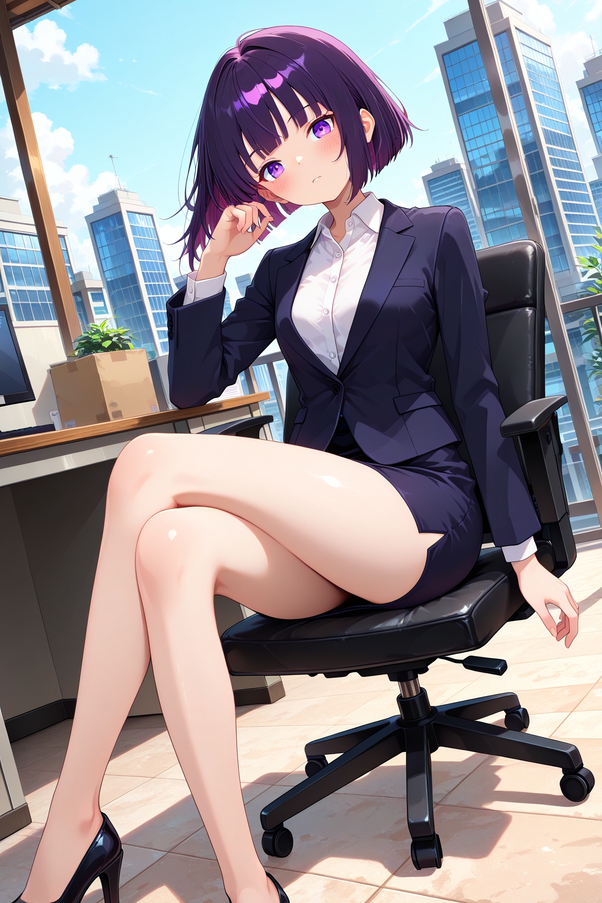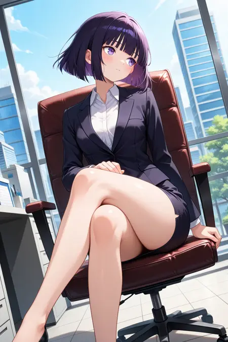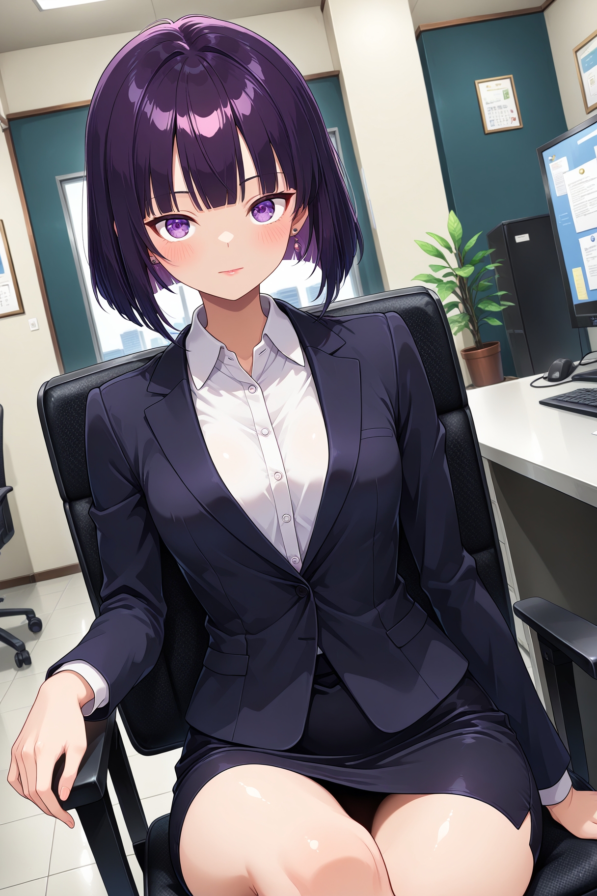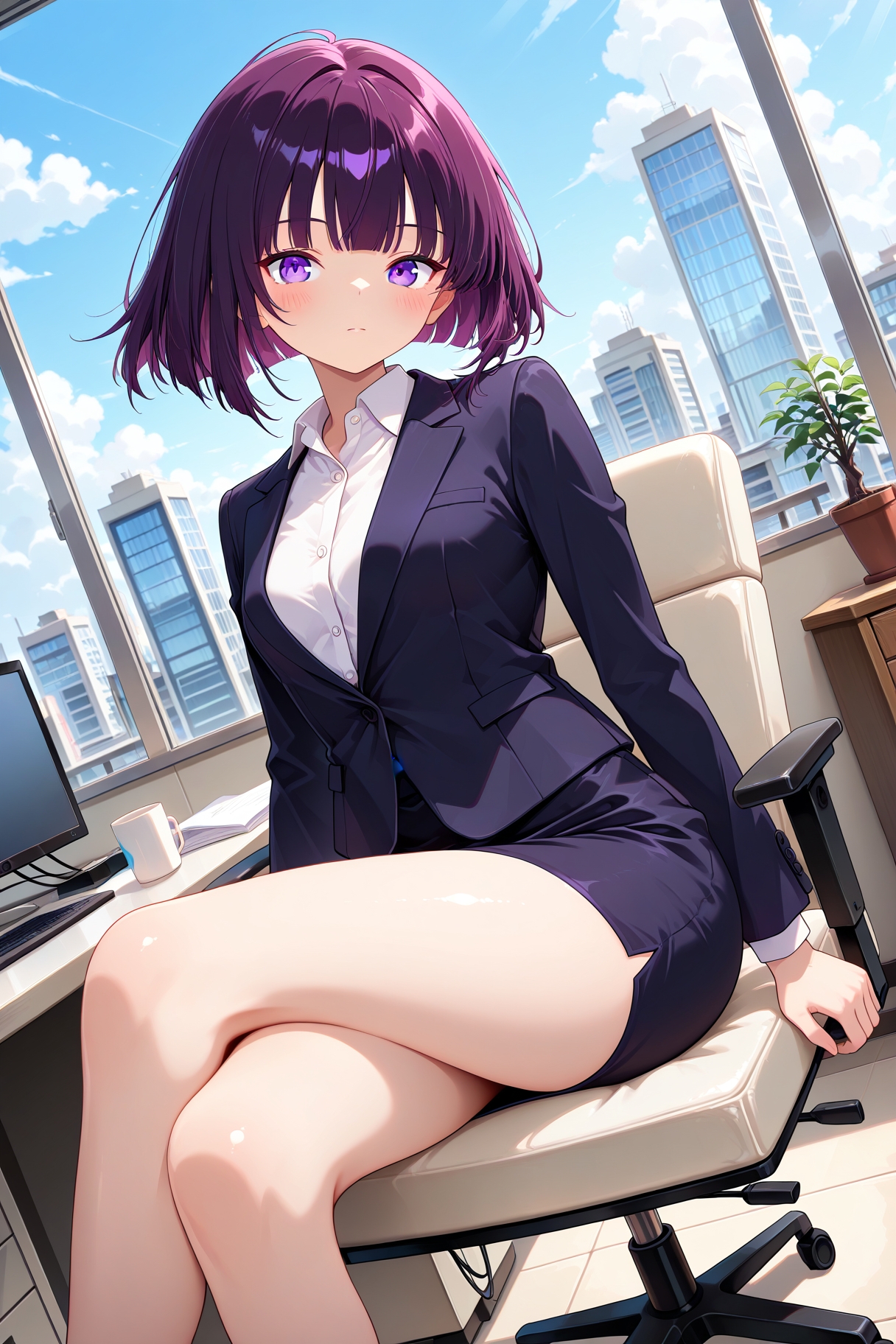 商务基础:1girl,solo,tomo_hotaru,short hair,bangs,purple eyes,black hair,purple hair,blush,bob cut,small breasts,blunt bangs