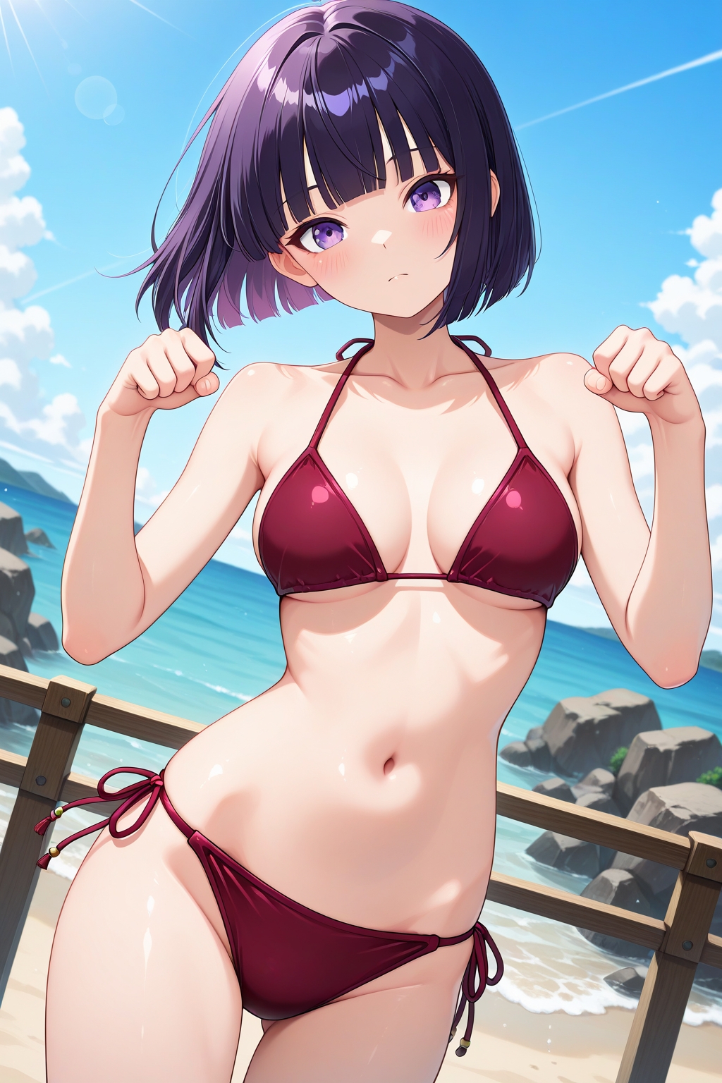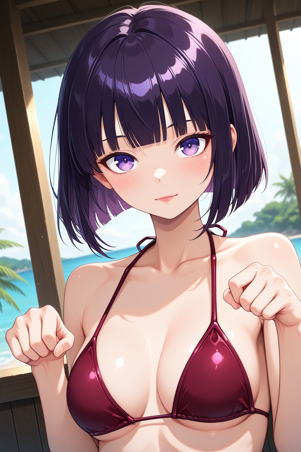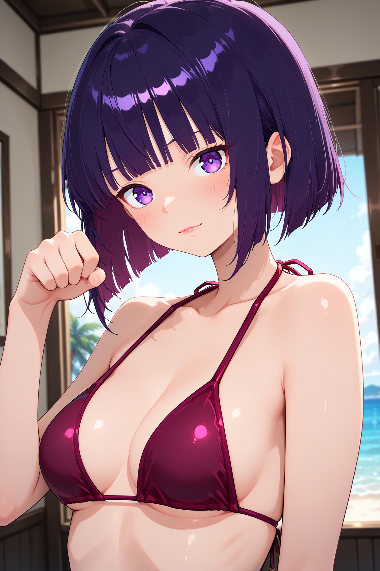 比基尼基础:1girl,solo,tomo_hotaru,short hair,bangs,purple eyes,black hair,purple hair,blush,bob cut,blunt bangs, medium breasts