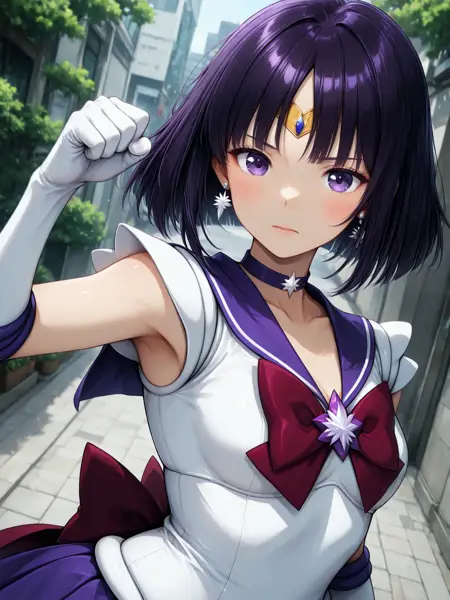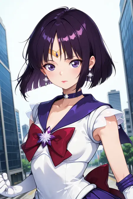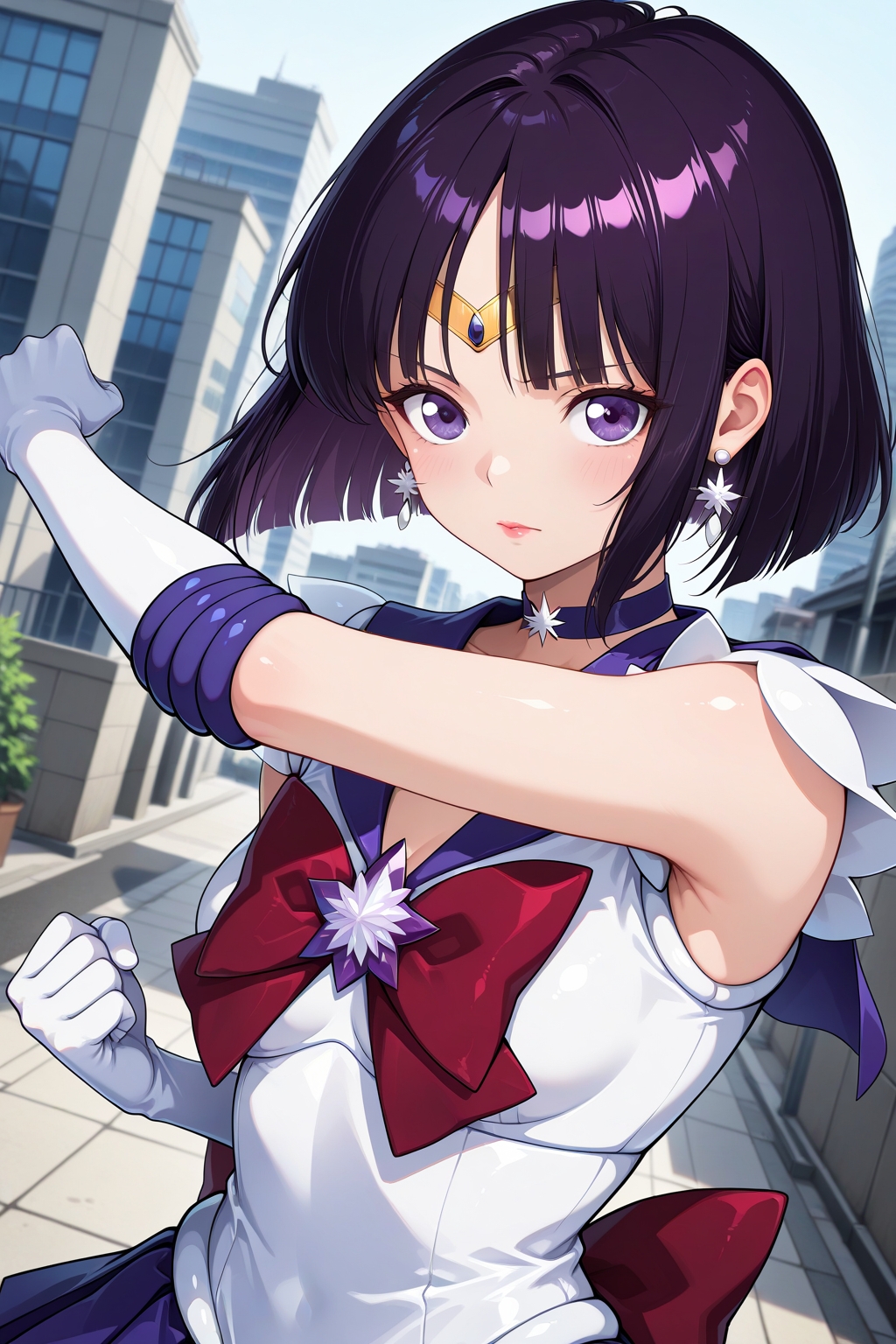 水手土星基础:1girl,solo,tomo_hotaru,short hair,bangs,purple eyes,black hair,purple hair,blush,earrings,bob cut,circlet,small breasts,star earrings,blunt bangs
