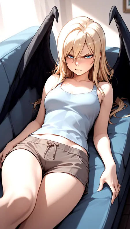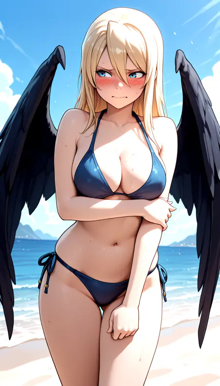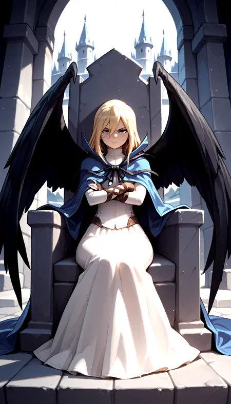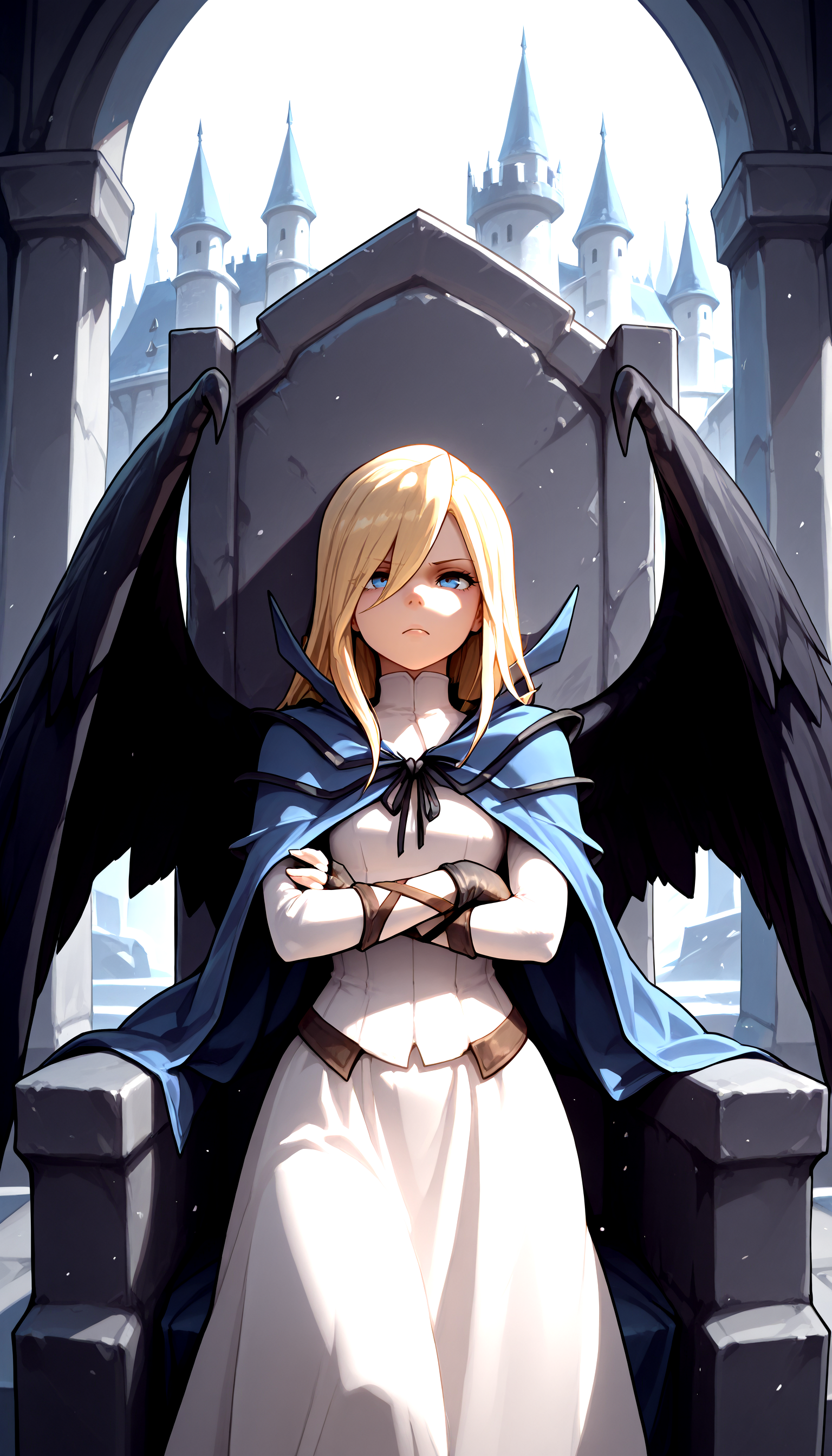 black_wings, blonde_hair, long_hair, blue_cape, white_dress, gloves, std_outfit, malice_rtpl,