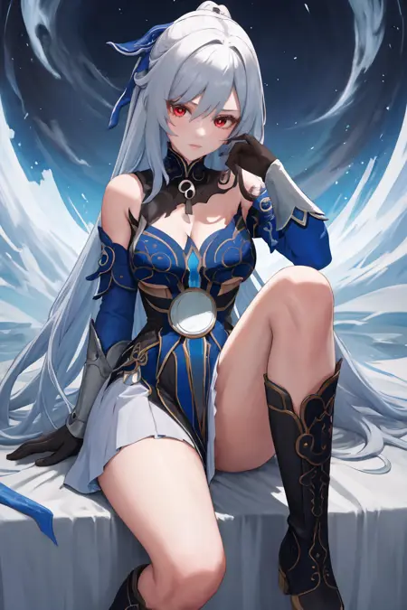 jingliu, hair ornament, red eyes, dress, cleavage, detached sleeves, black gloves