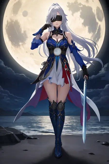 jingliu, hair ornament, blindfold, dress, cleavage, detached sleeves, black gloves
