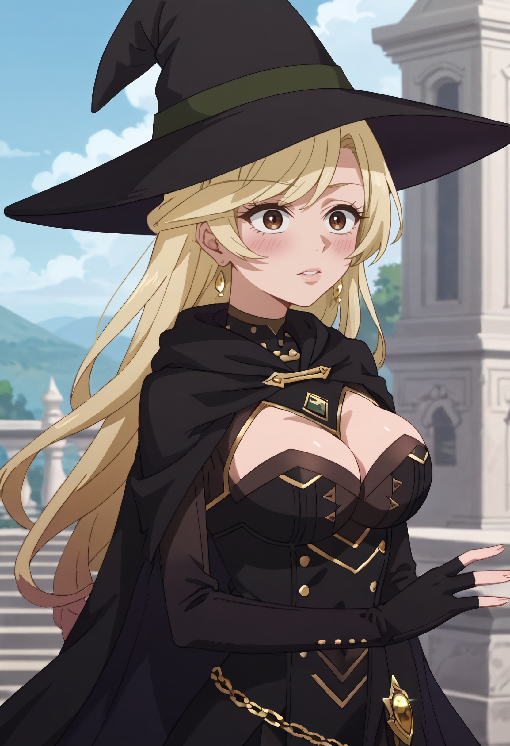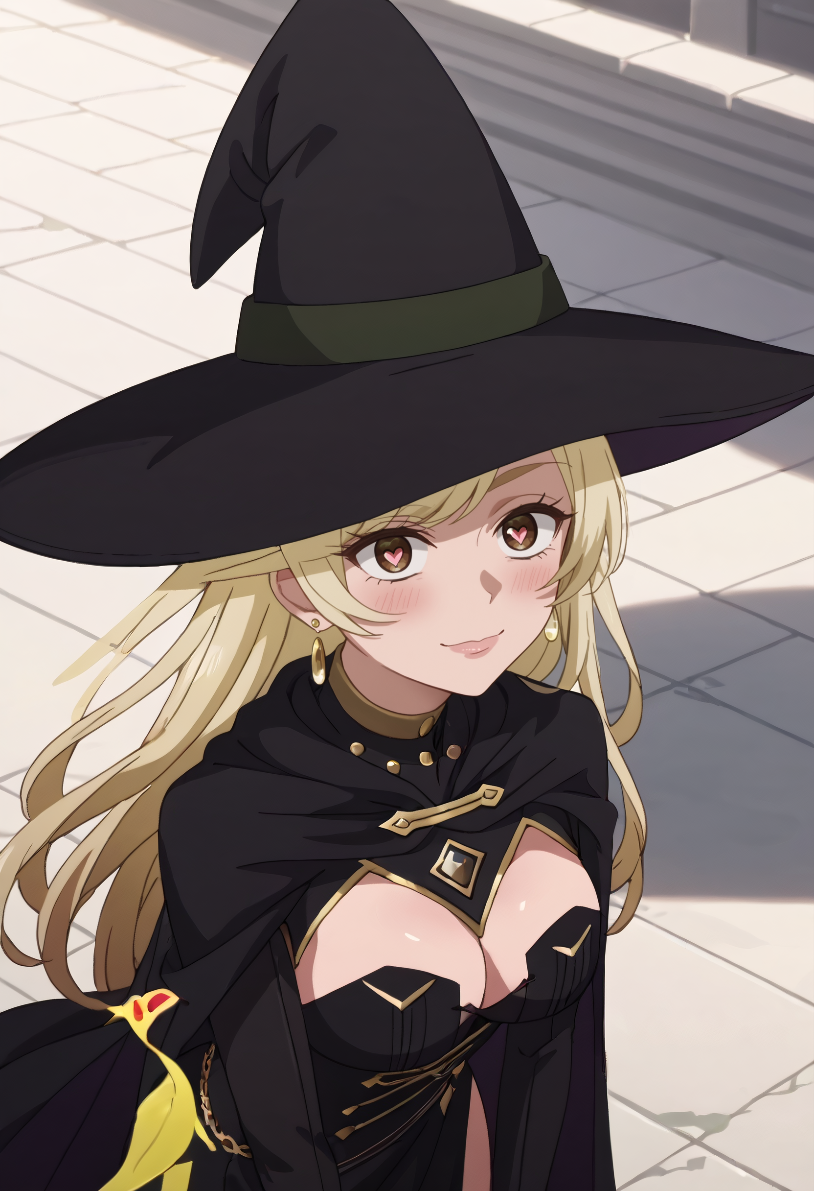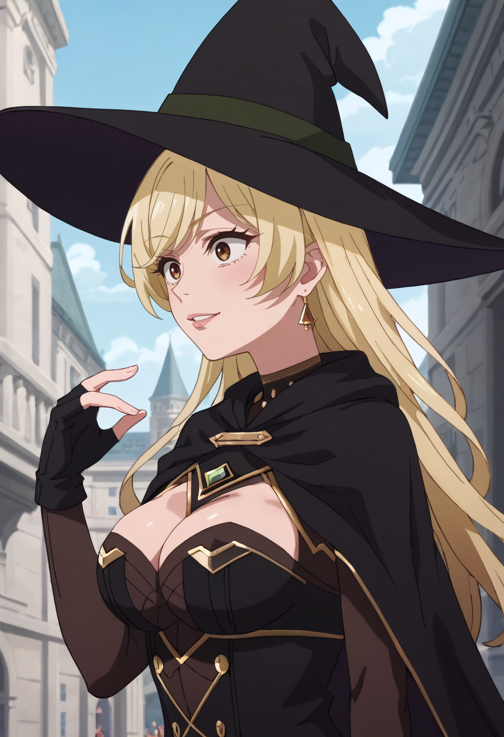 帽子、魔女の帽子、マント、手袋、魔女、胸元、黒い頭部装飾、指先が開いた手袋、黒い手袋、ドレス、黒いドレス、黒いマント、ハート型のイヤリング、長袖、