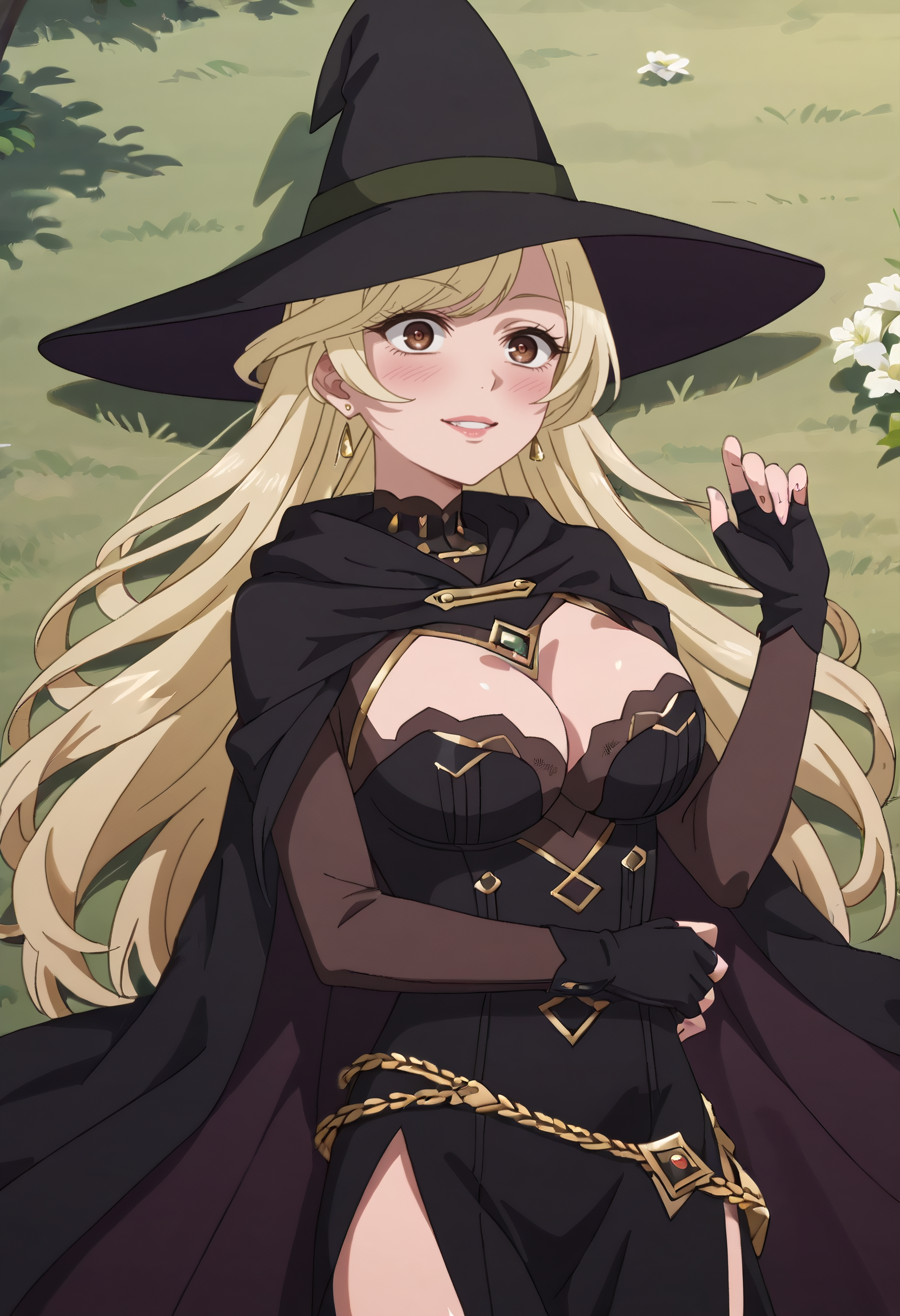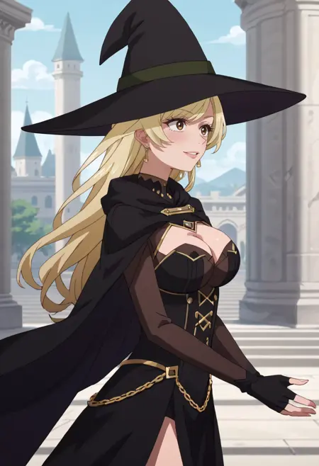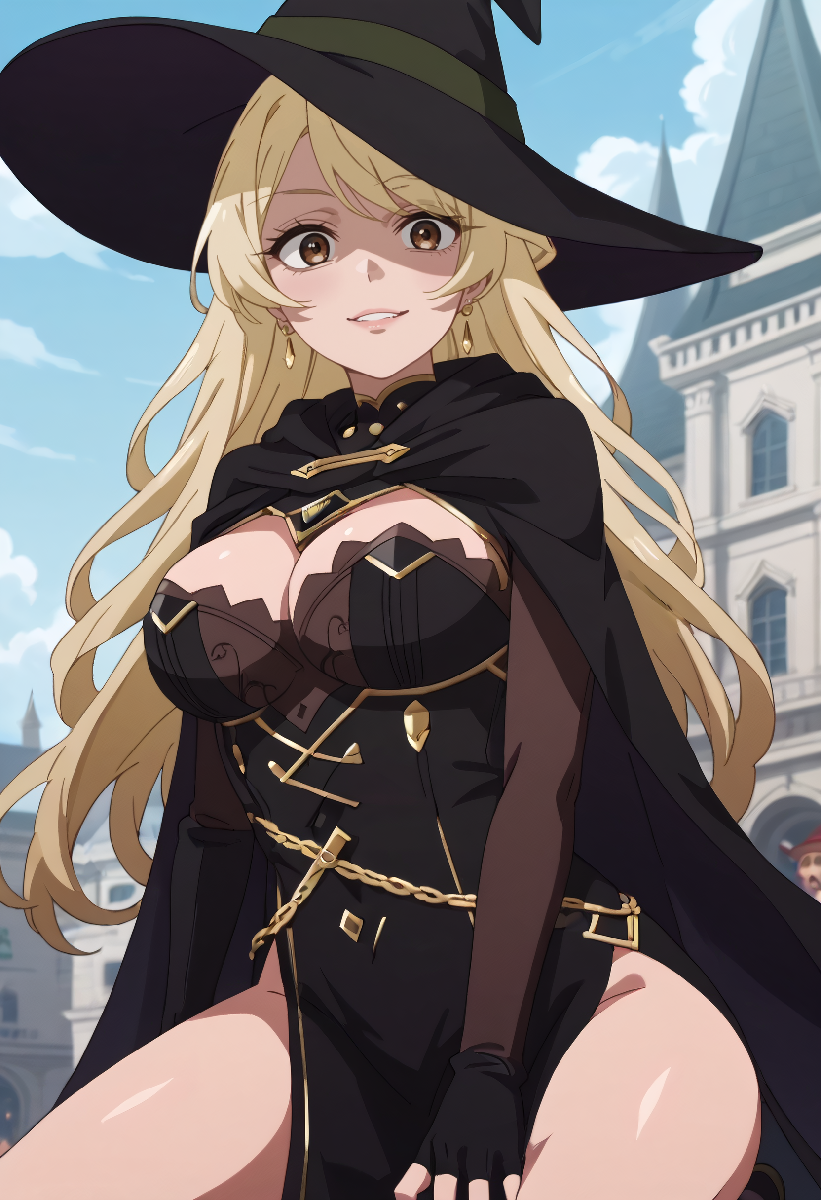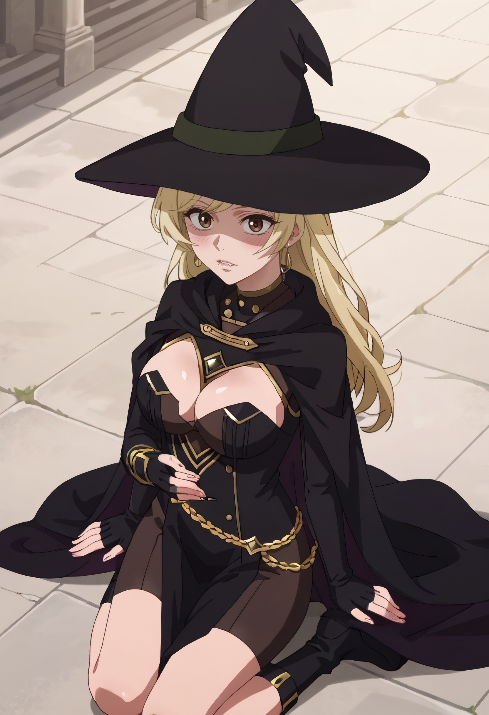 帽子、魔女の帽子、マント、手袋、魔女、胸元、黒い頭部装飾、指先が開いた手袋、黒い手袋、ドレス、黒いドレス、黒いマント、ハート型のイヤリング、長袖、