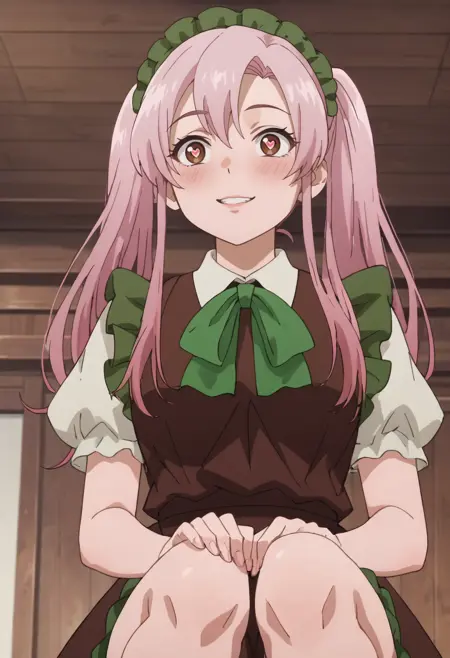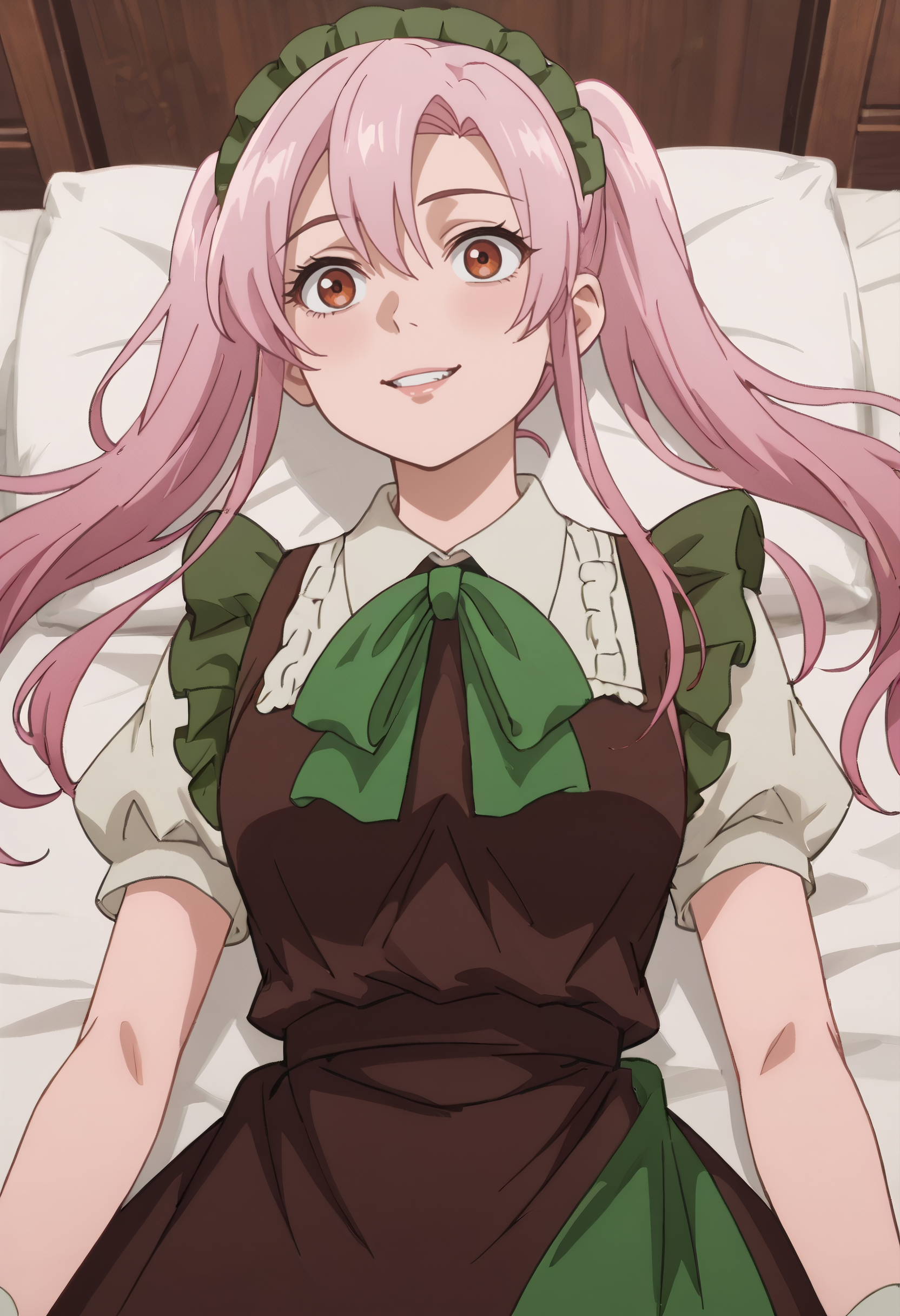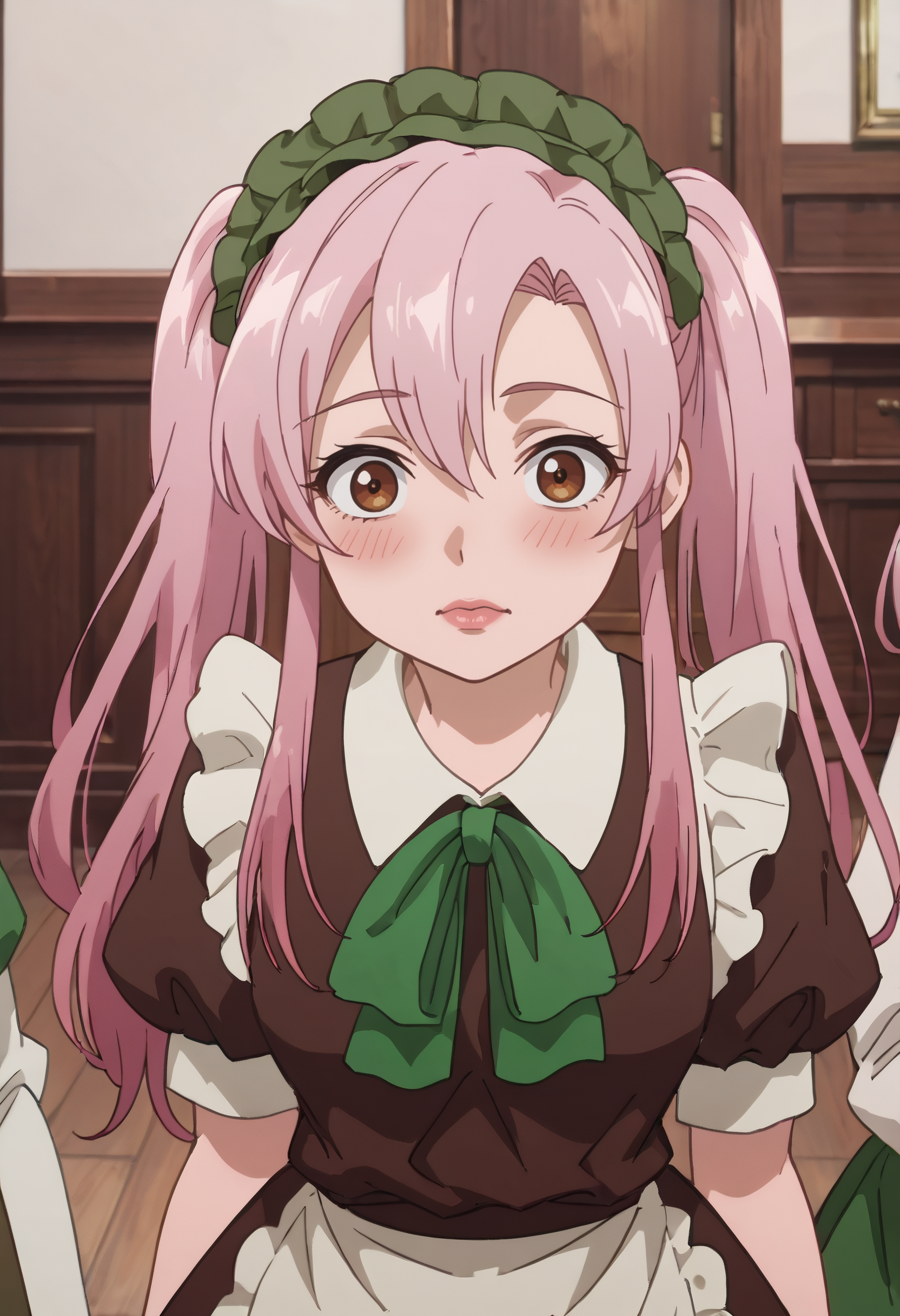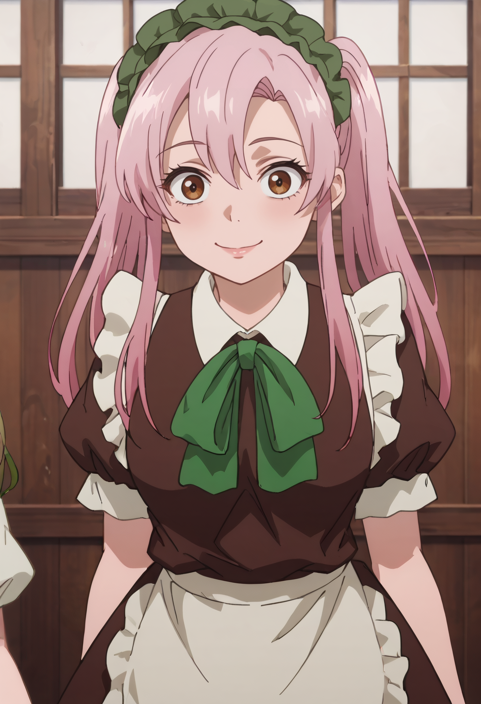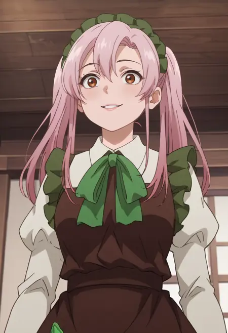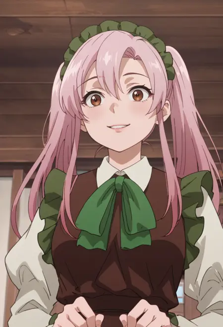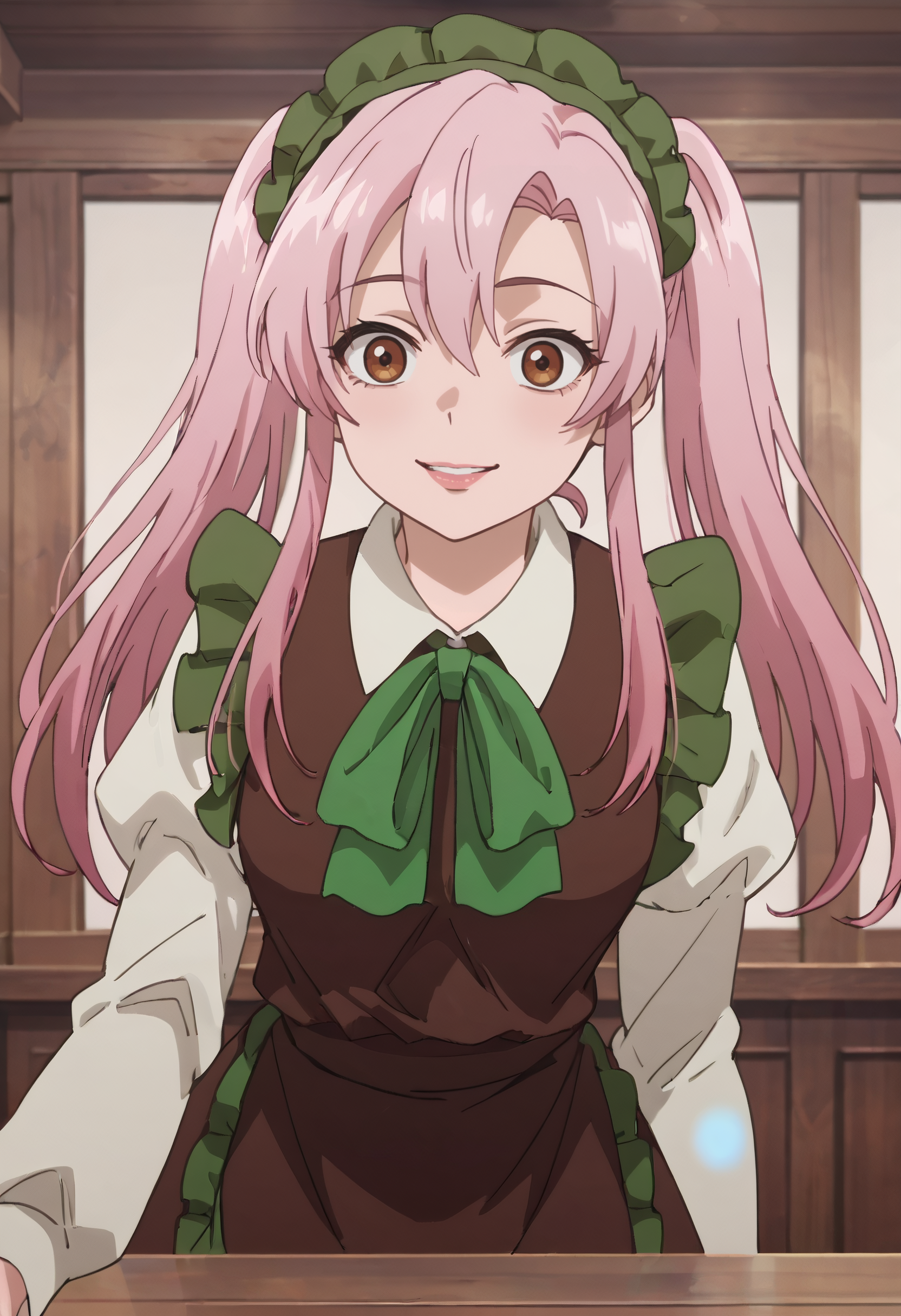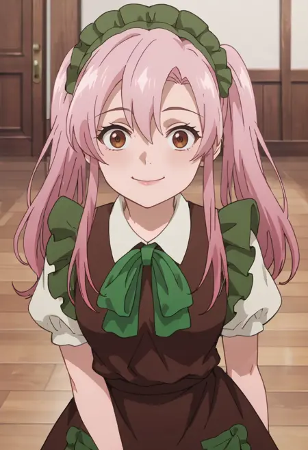 A4OMarket, brown eyes, long hair, pink hair, hair between eyes, twintails, green hairband, bangs,