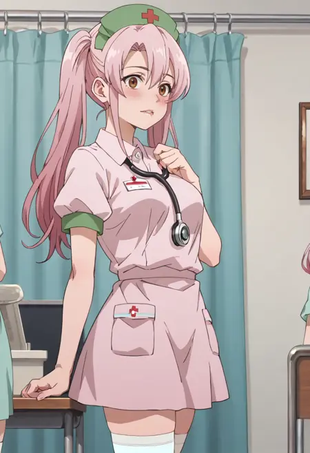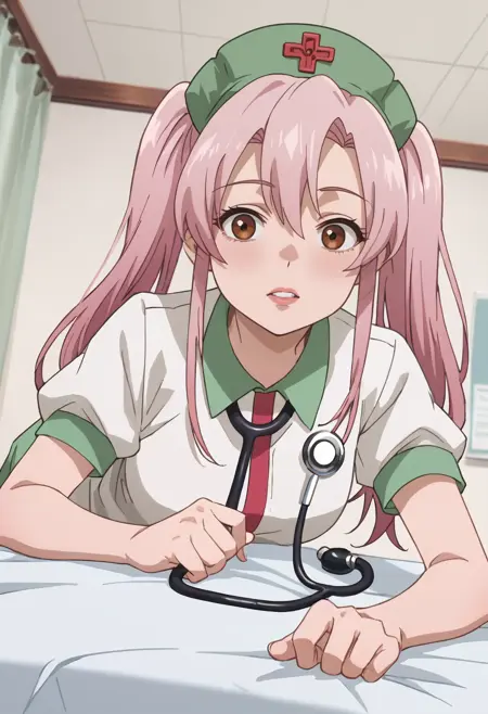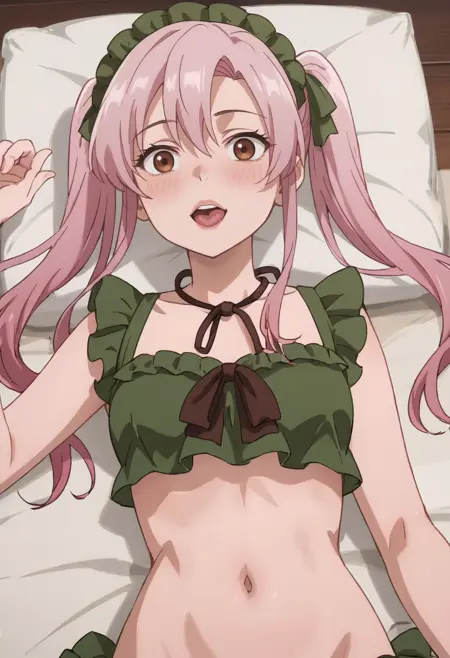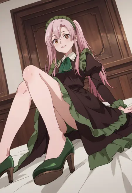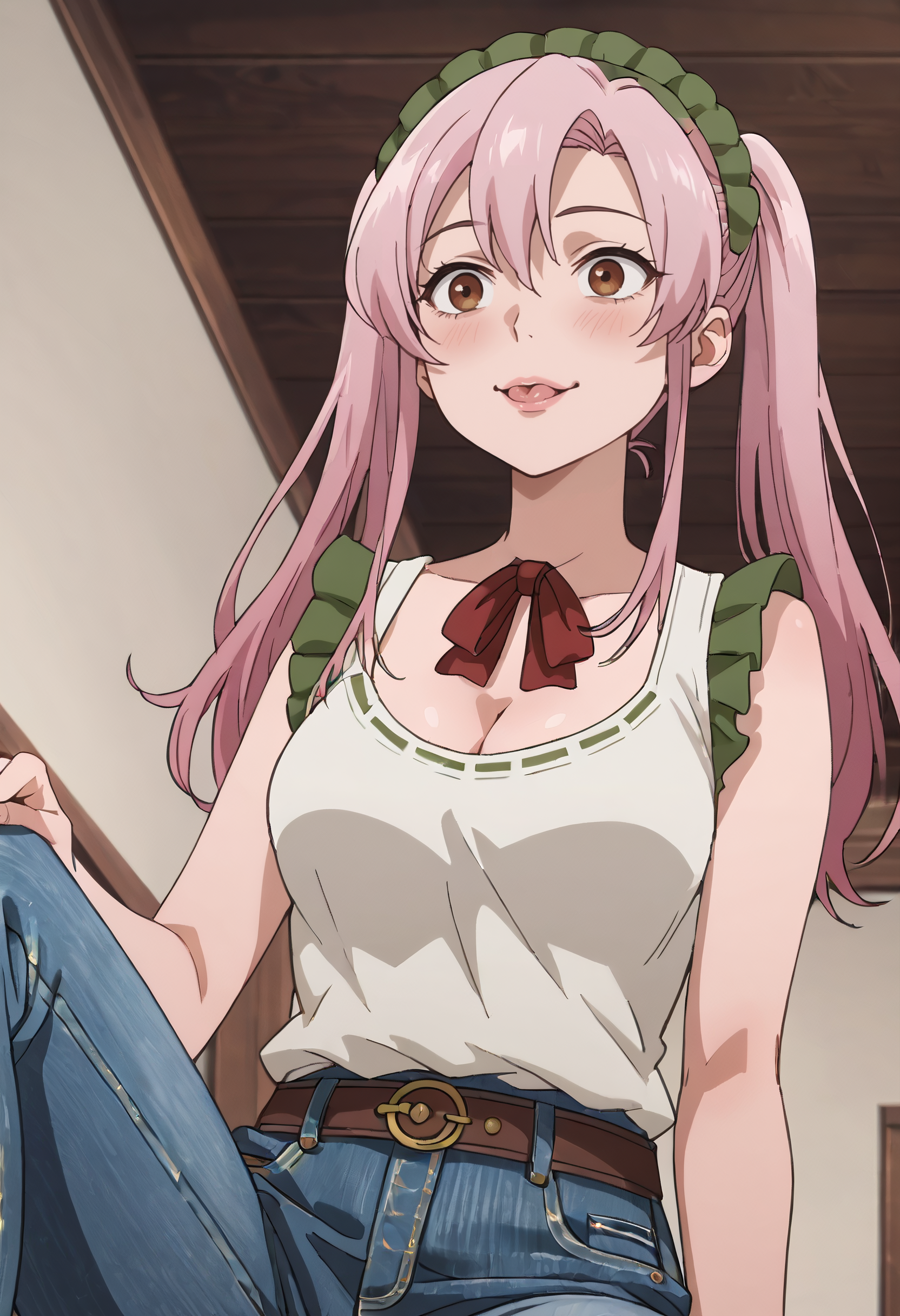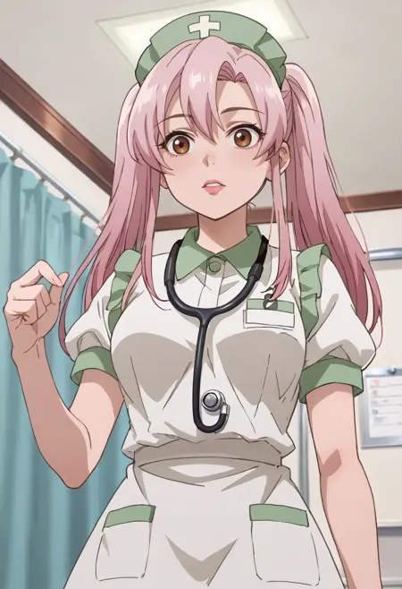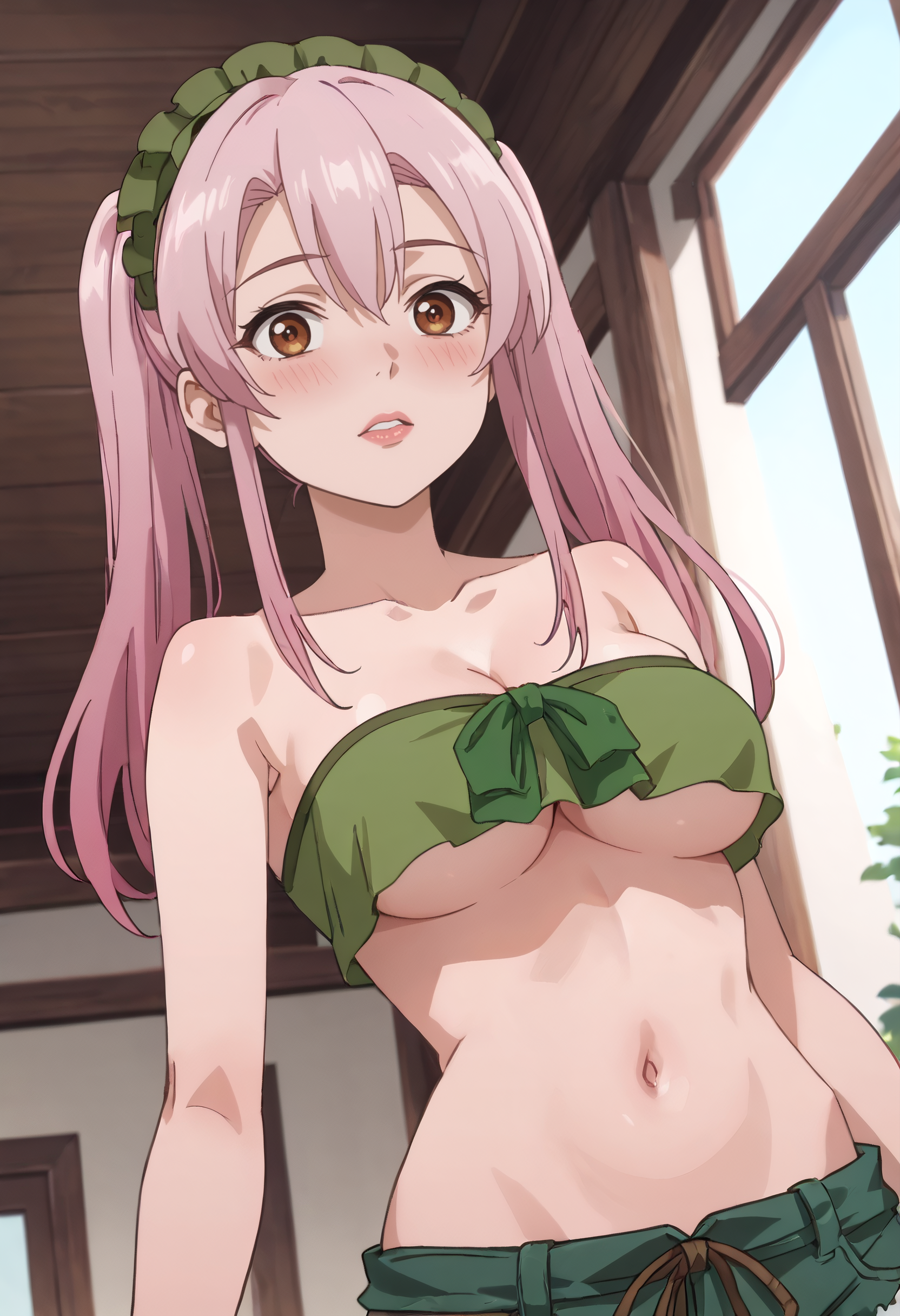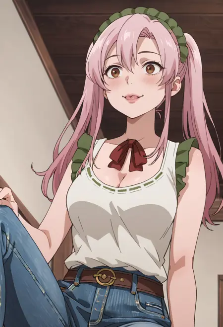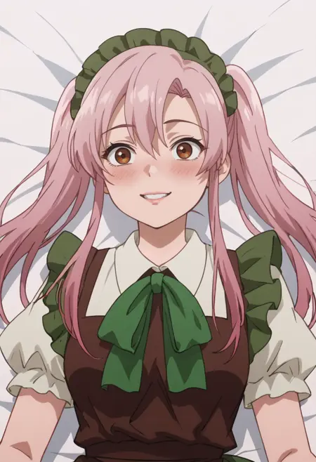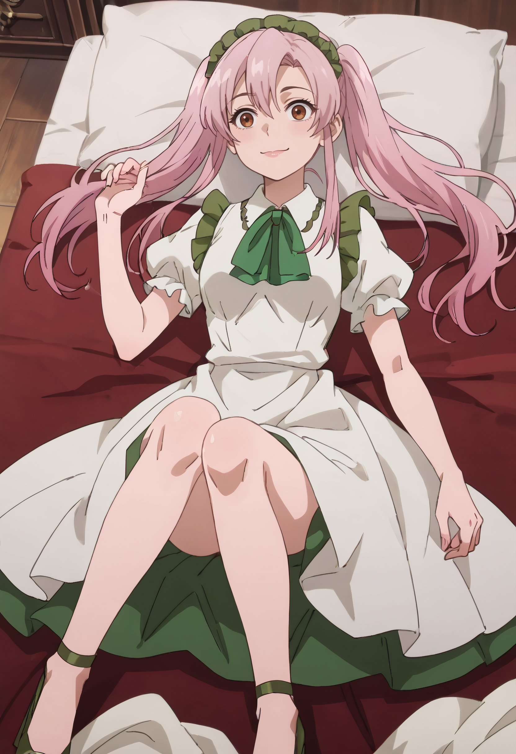 A4OMarket, brown eyes, long hair, pink hair, hair between eyes, twintails, green hairband, bangs,