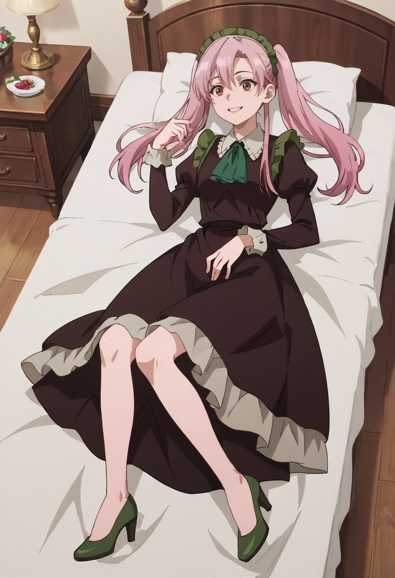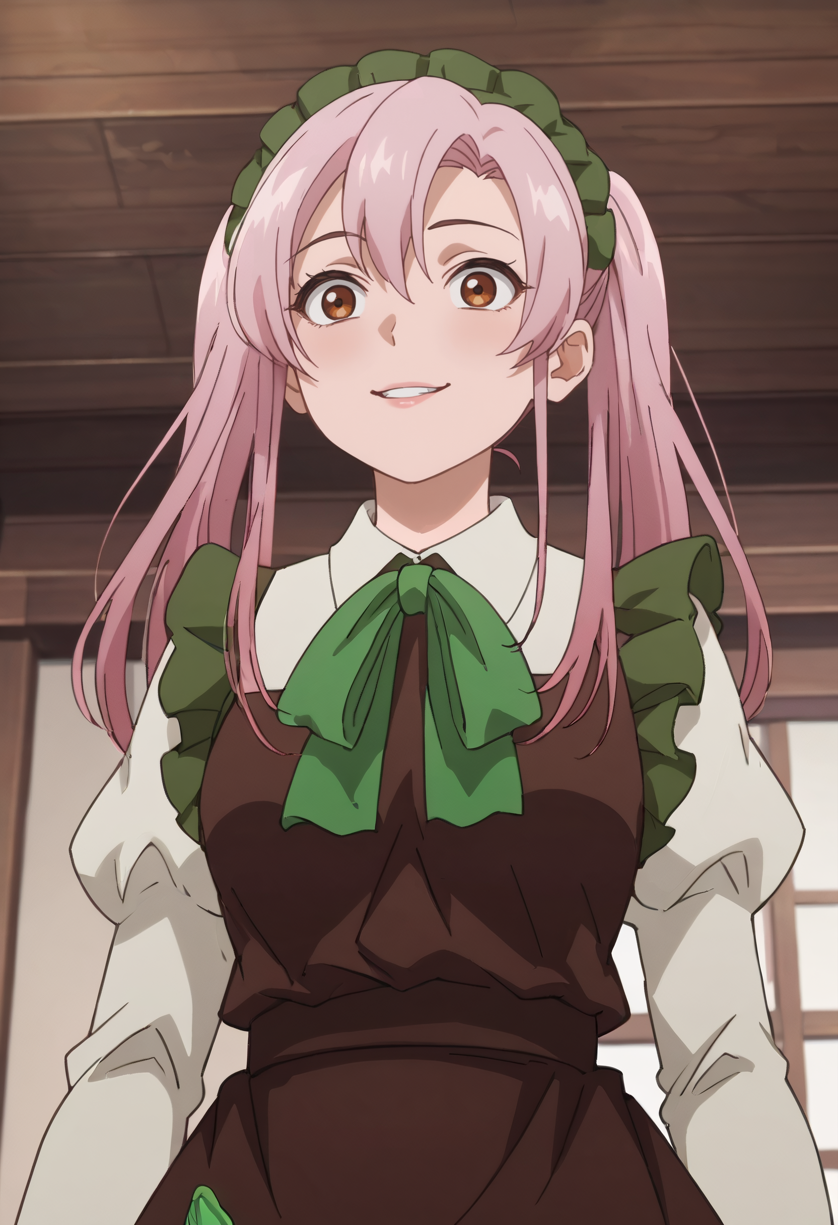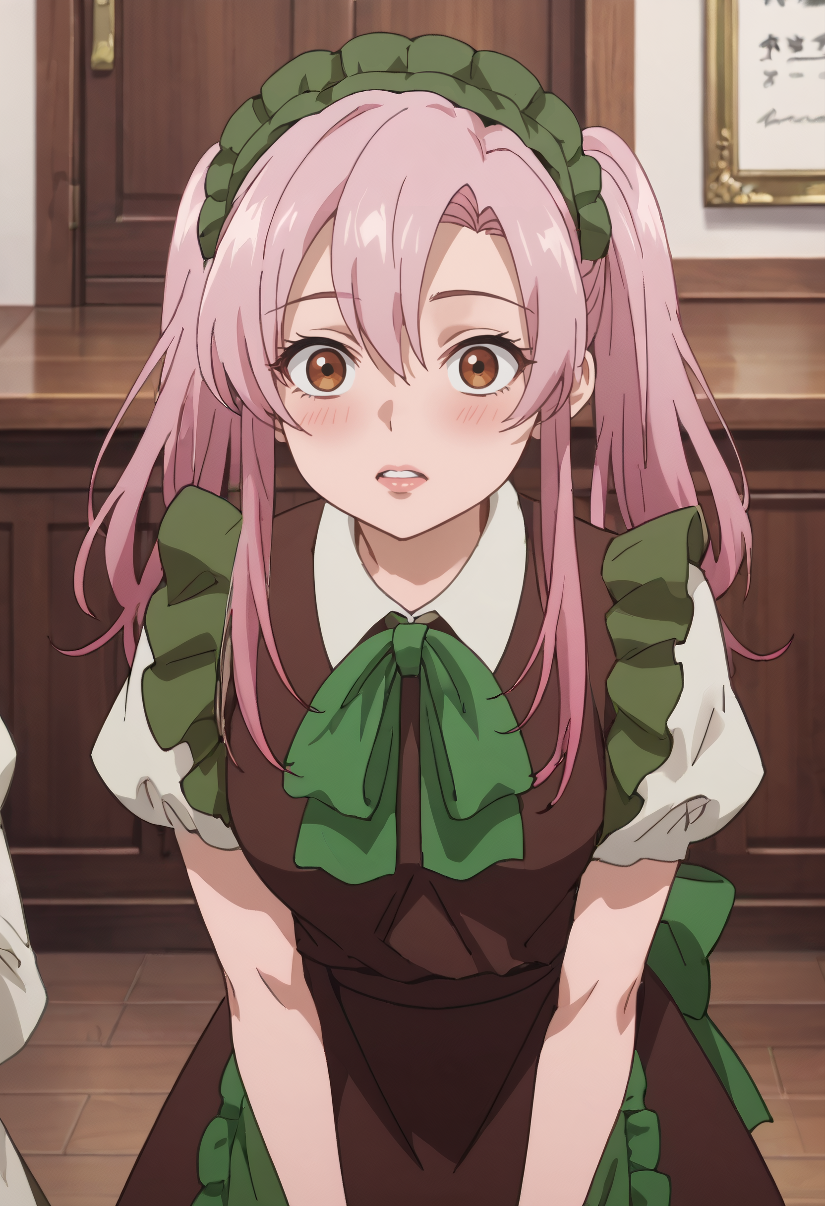 bow, bowtie, green bow, frills, shirt, white shirt, frilled apron, brown dress, green headband,