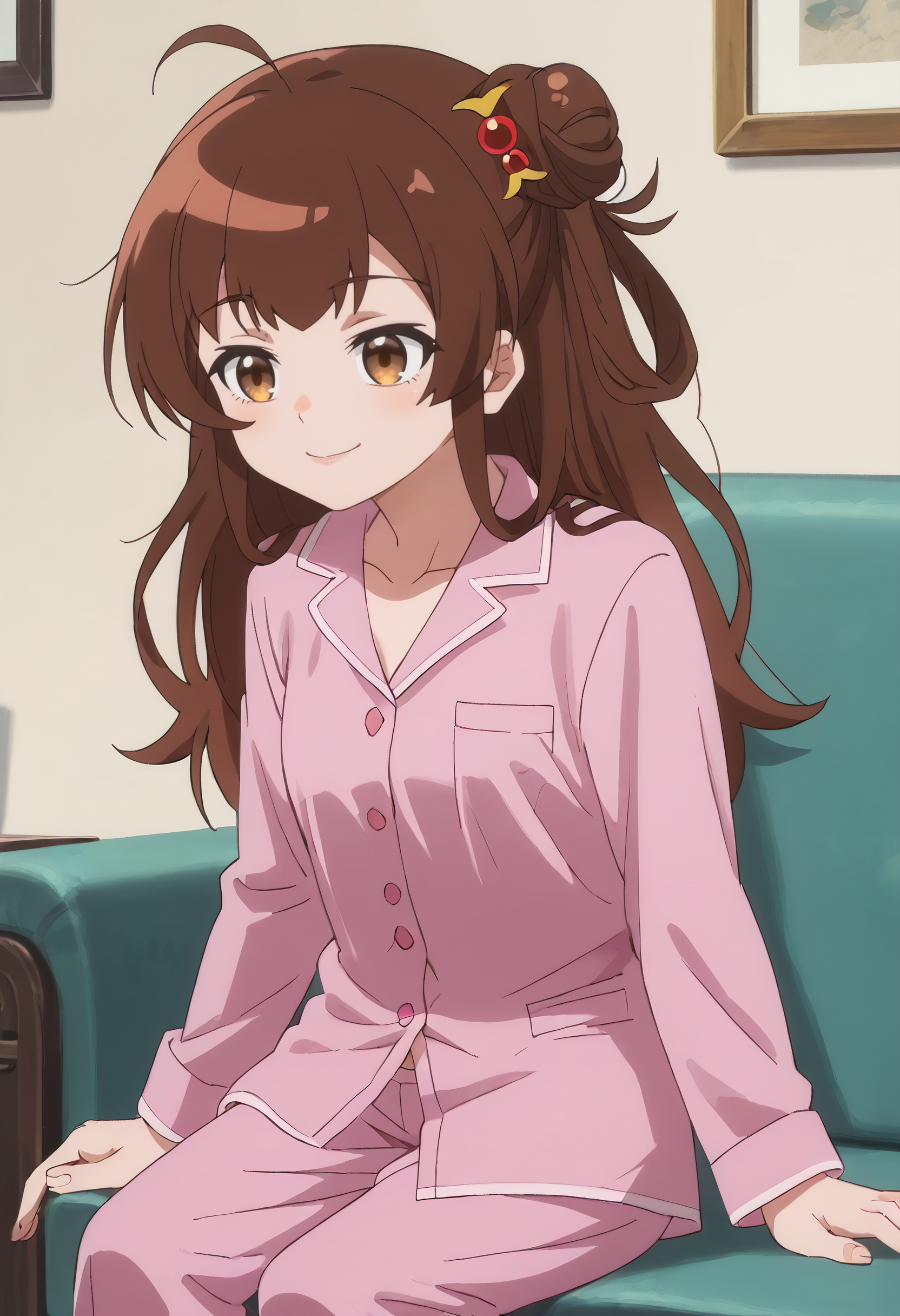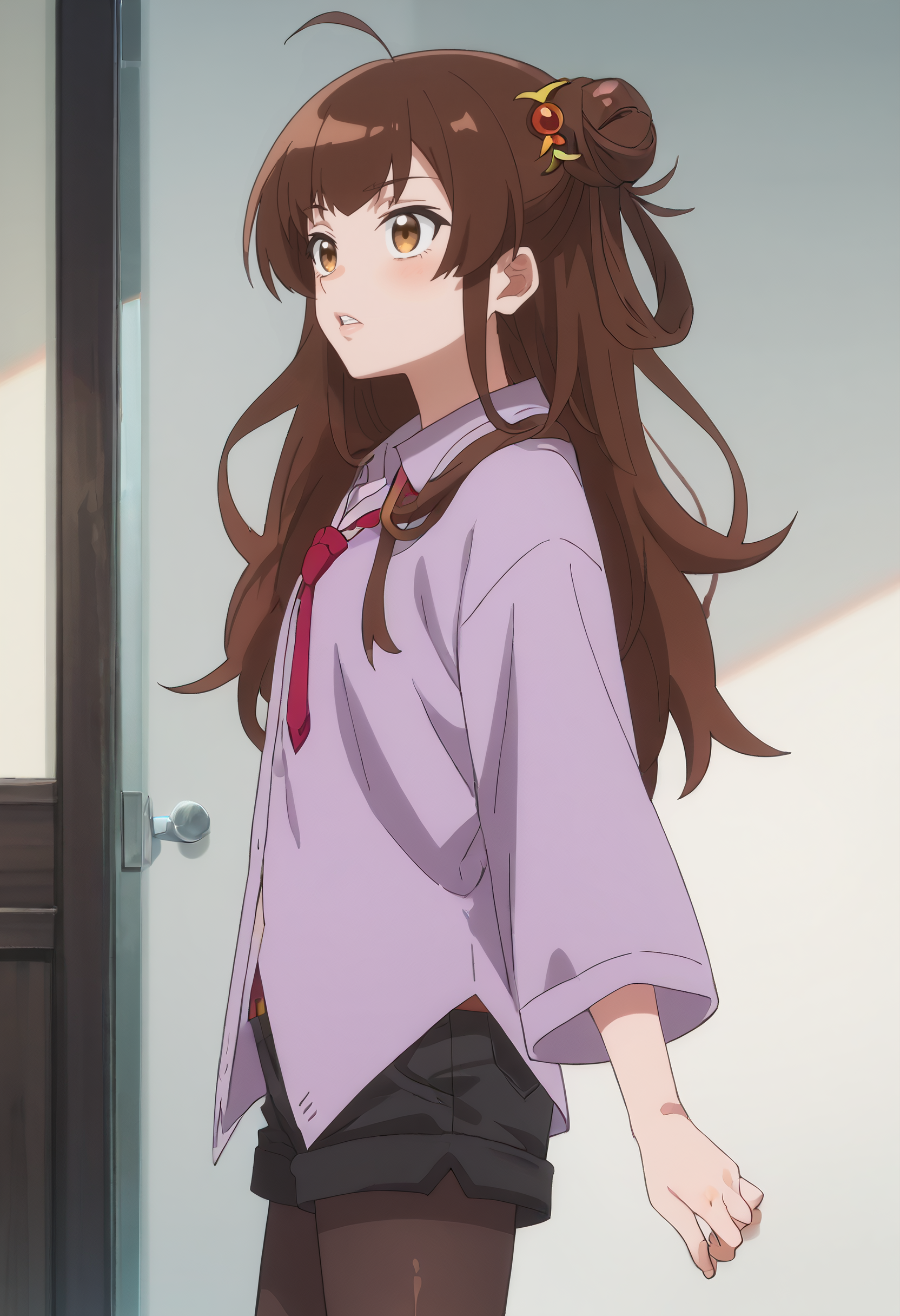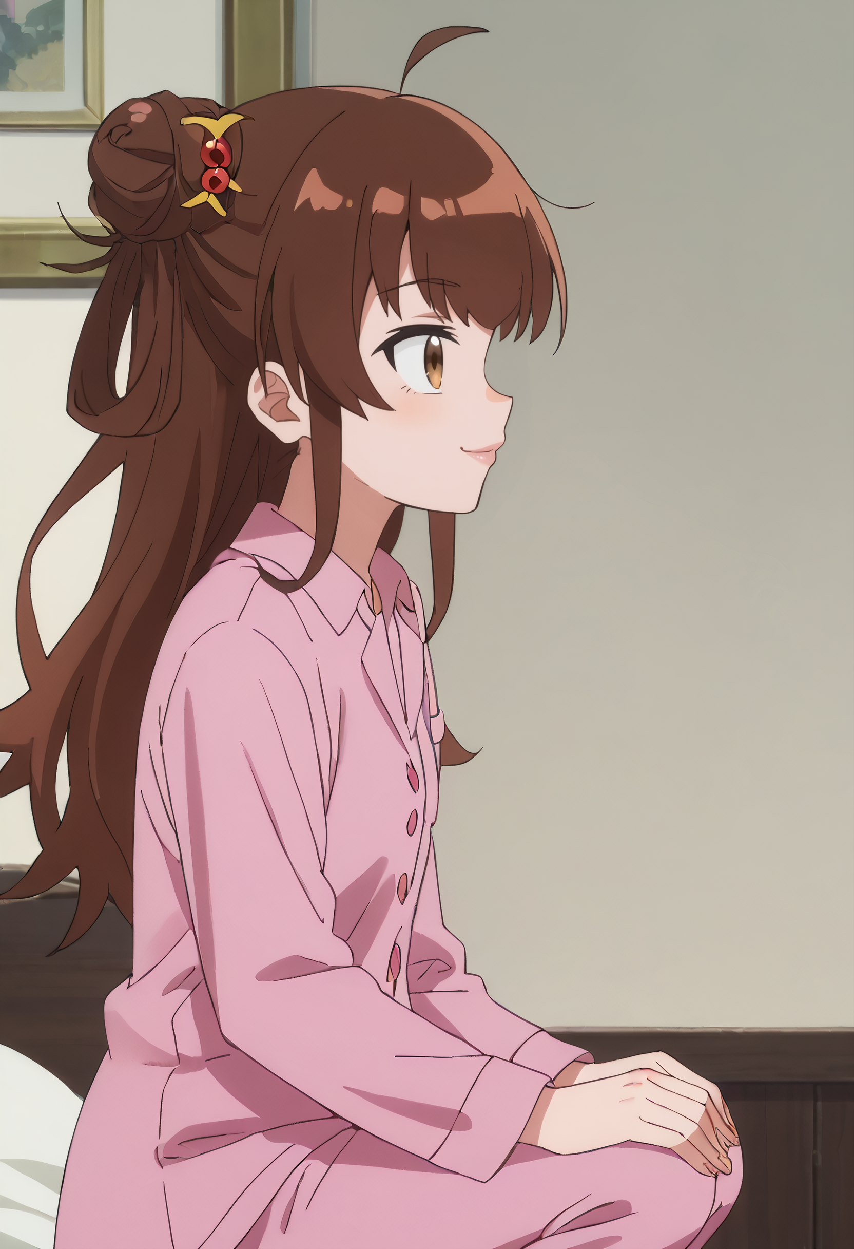 AMGMeg, brown hair, long hair, bangs, brown eyes, eyebrows visible through hair, ahoge, hair bun, side bun,
