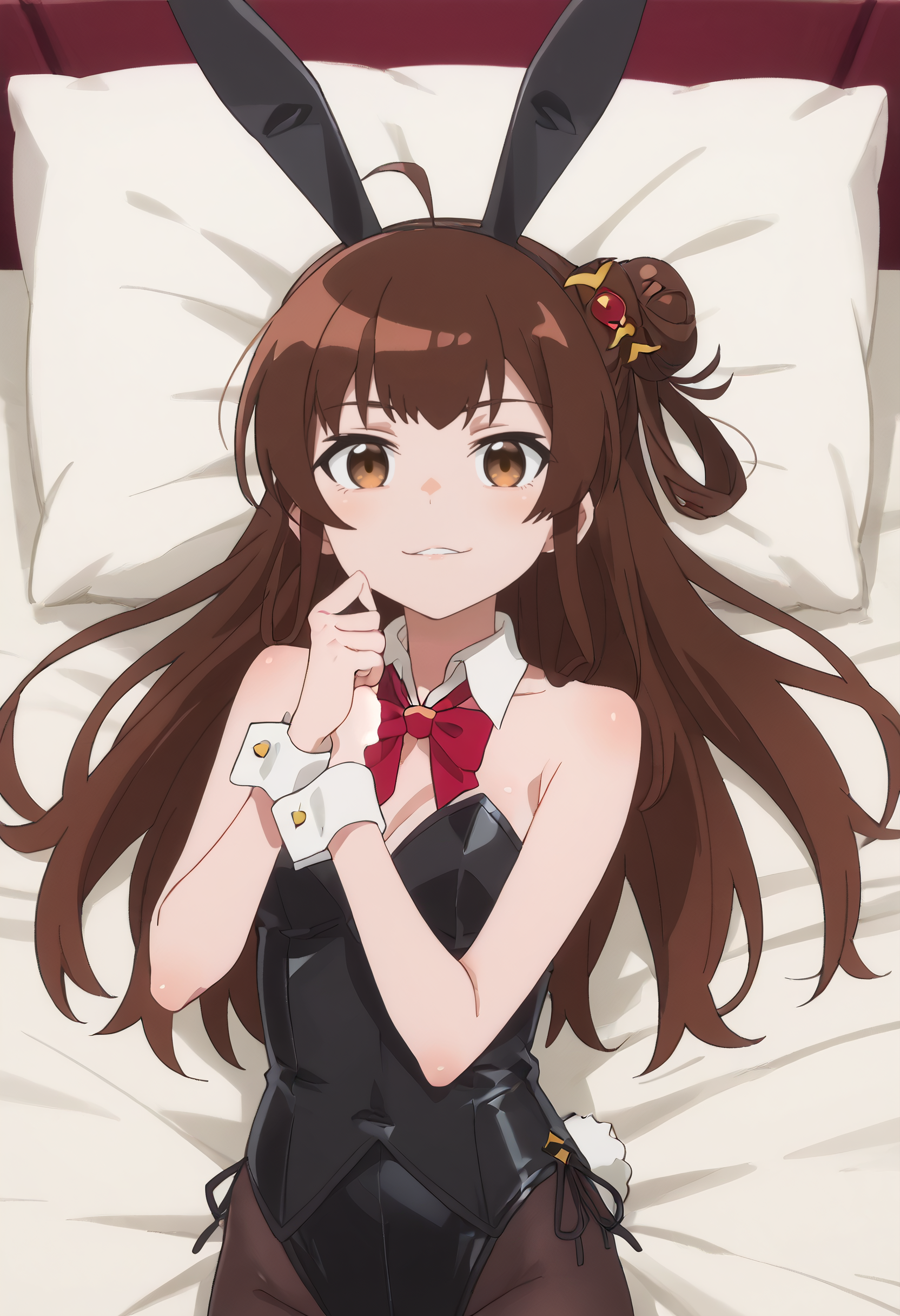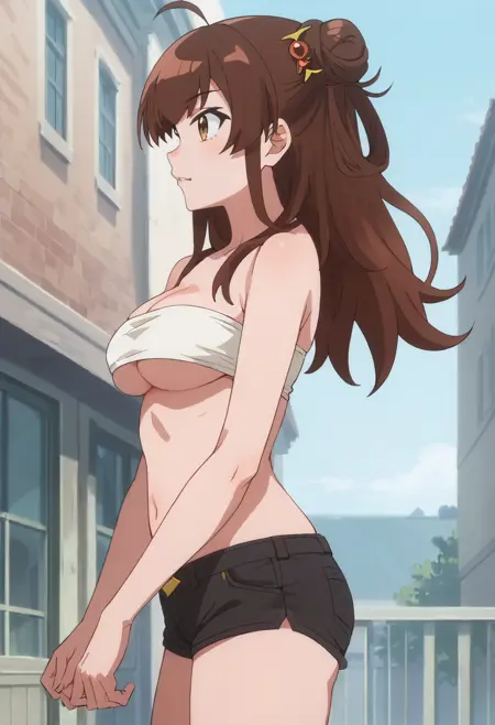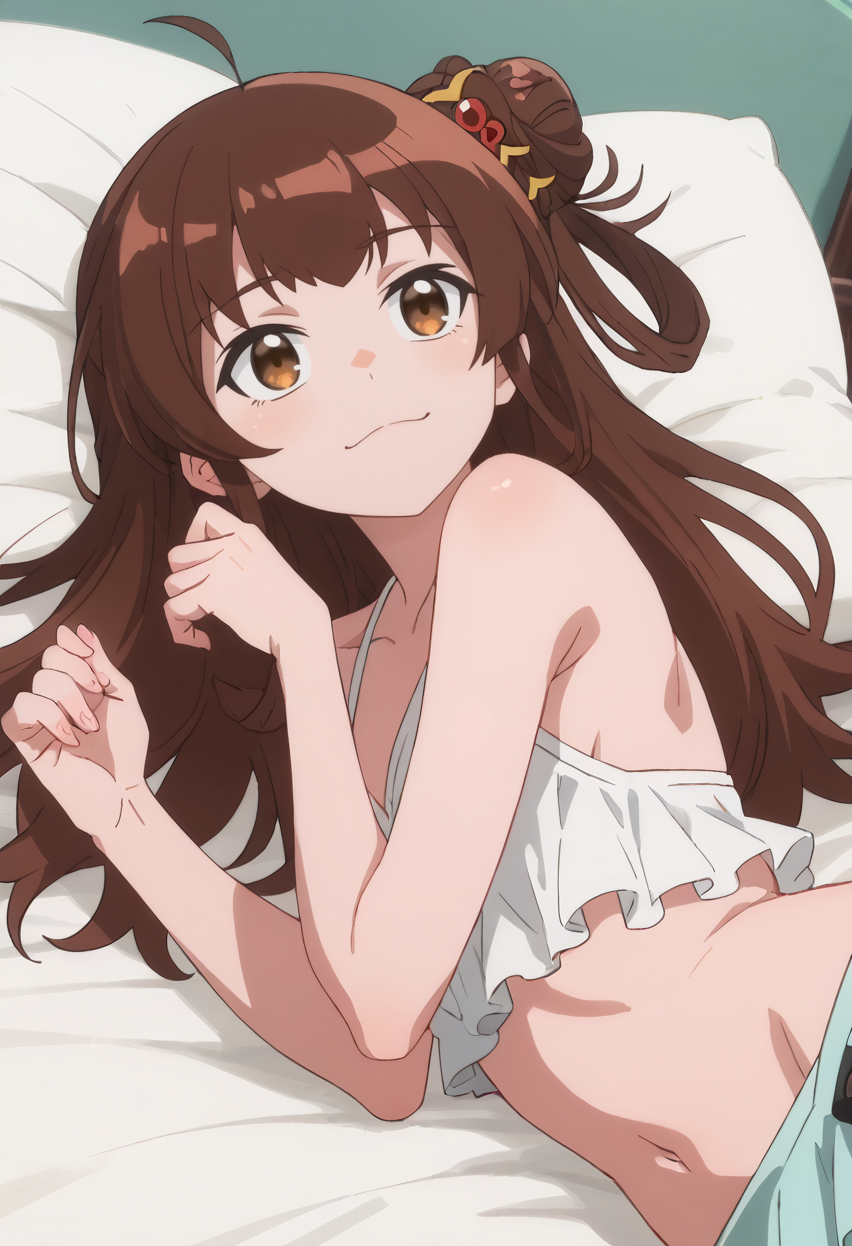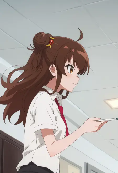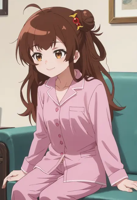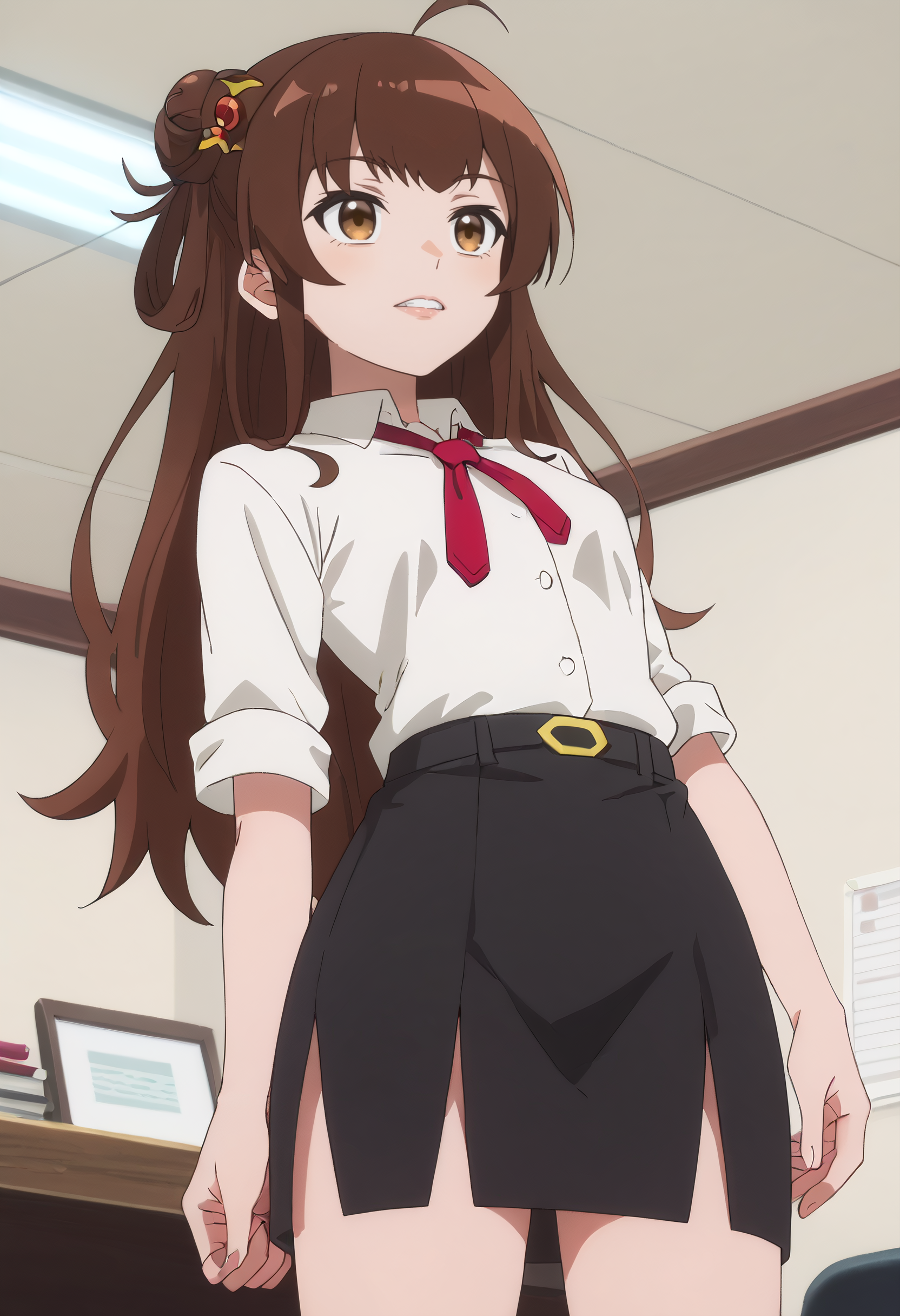 AMGMeg, brown hair, long hair, bangs, brown eyes, eyebrows visible through hair, ahoge, hair bun, side bun,