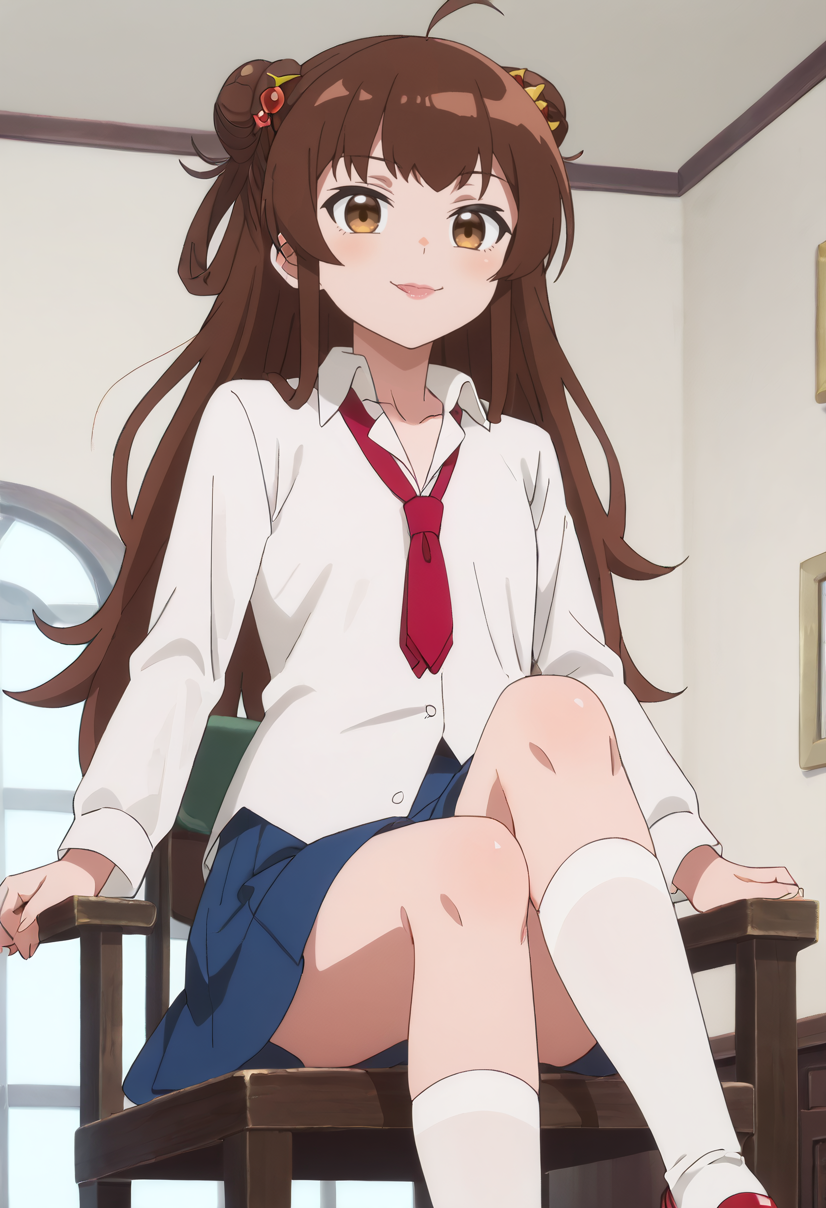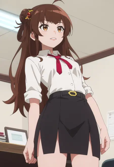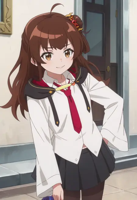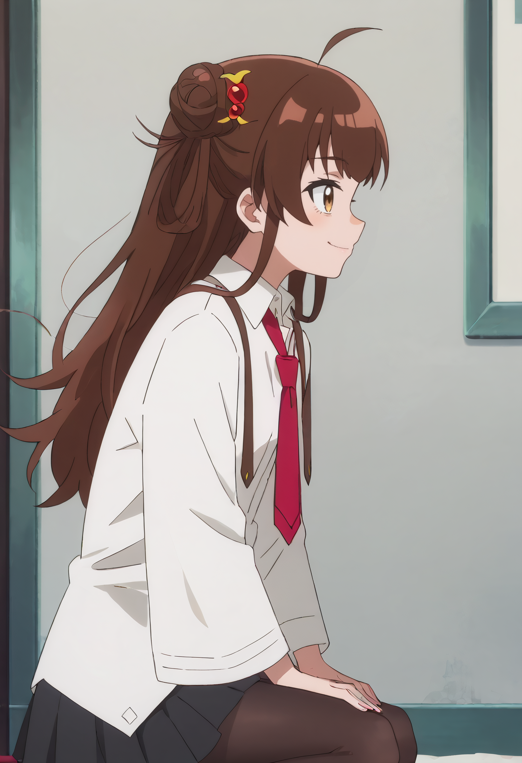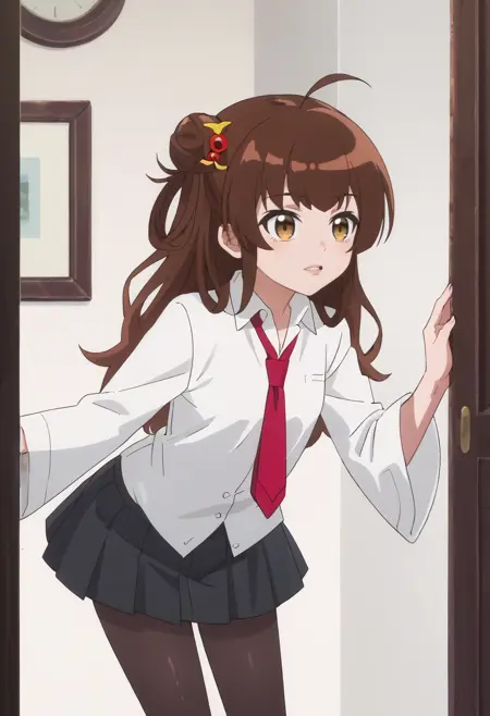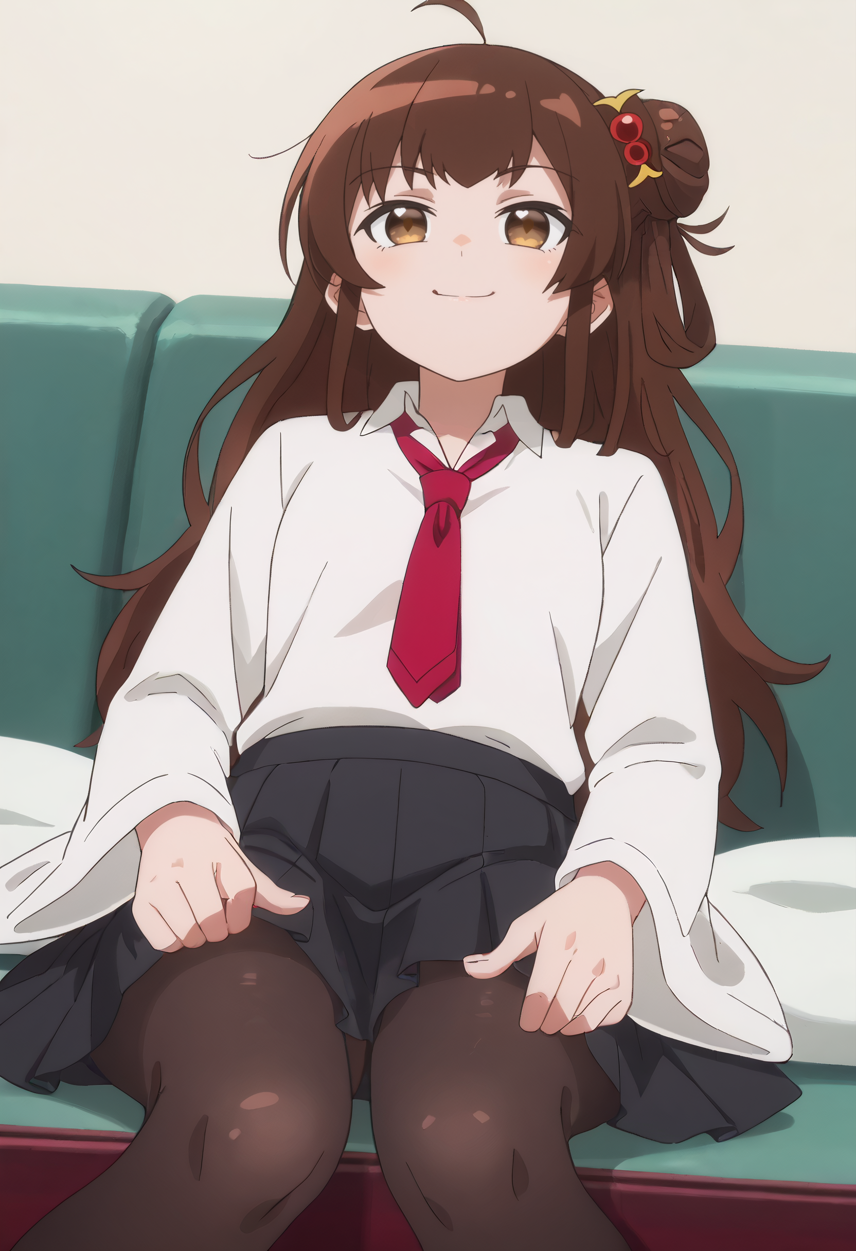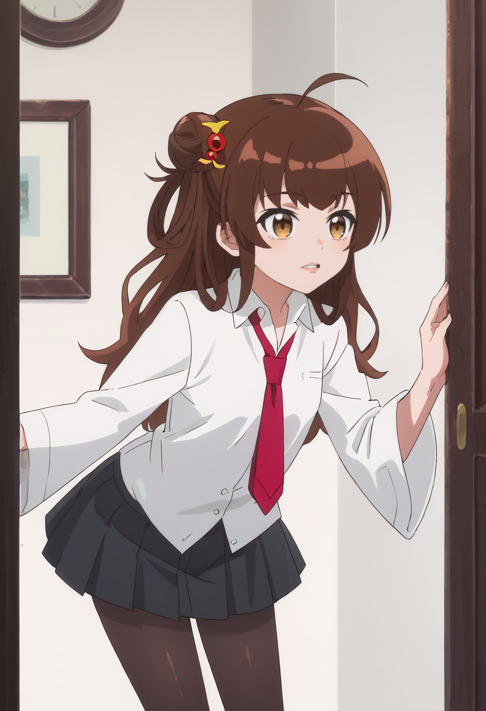 MegOutfit, shirt, white shirt, hair ornament, necktie, collared shirt, red necktie, school uniform, long sleeves, skirt, pantyhose, pleated skirt, black skirt, wing collar, wide sleeves, black legwear,