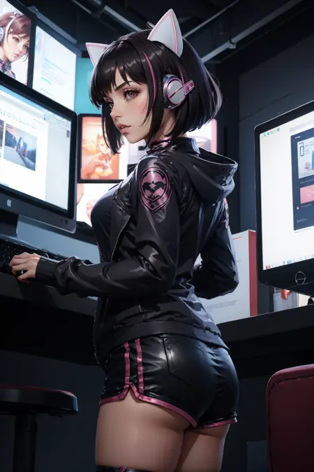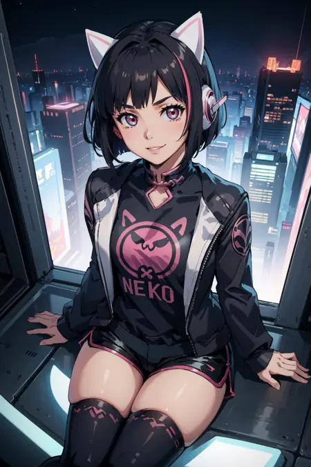 그녀의 전형적인 모습을 위해 "고양이 귀, 헤드폰, 검은 재킷, 긴 소매, 검은 민소매 상의, 검은 반바지"를 추가하세요.