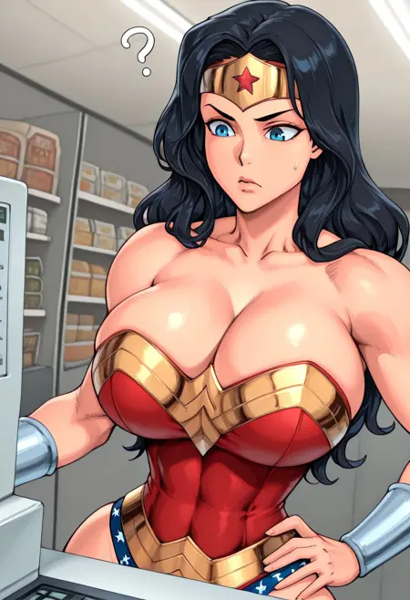 gold forehead protector, bare shoulders, cleavage, collarbone, red leotard, gold chest symbol, gold belt, blue underwear, star symbols, silver cuffs,