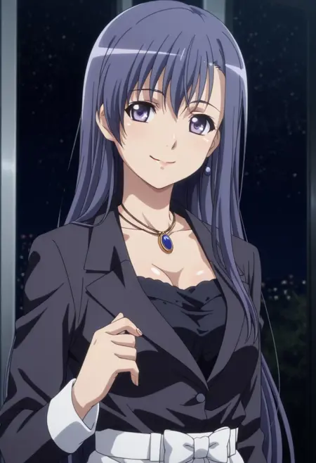 옷: 검정 재킷, 흰 치마, 노출이 많은 검정 블라우스, 사파이어 펜던트 목걸이, 공식 유니폼