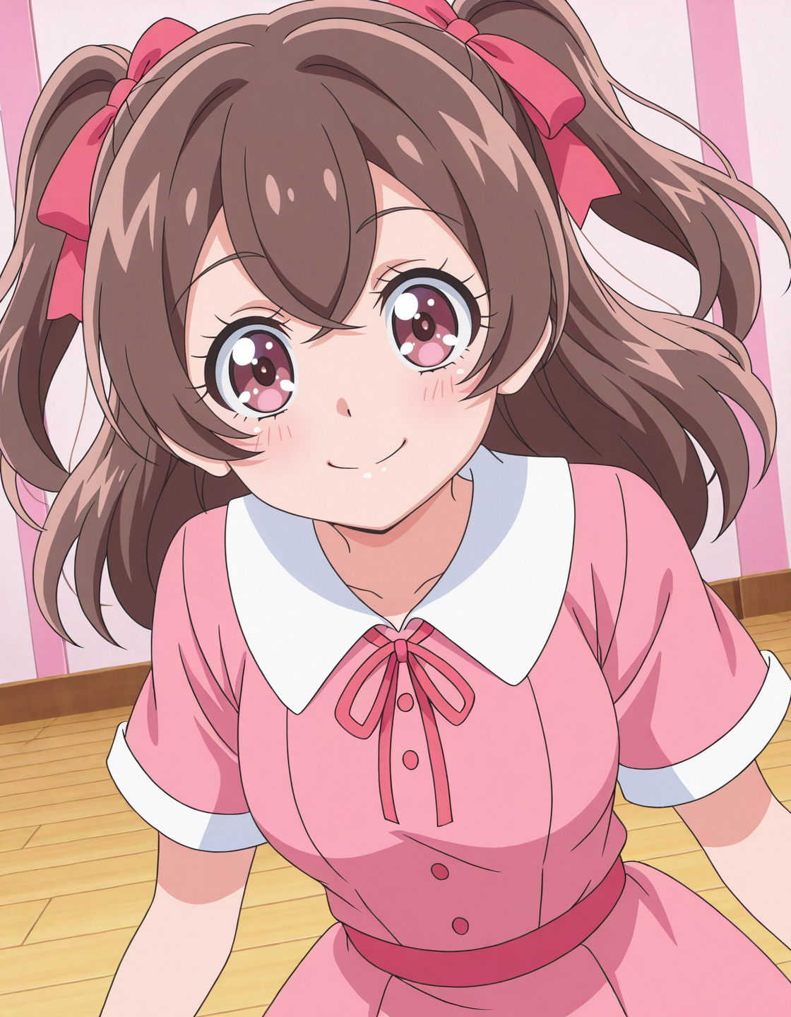 アニメスクリーンキャプチャ、ソロ、1girl、yuisummer、nagomiyui、ピンクのドレス、リボンタイ、短袖、lora:nagomiyui_IL:0.8、高解像度、素晴らしい品質、最上品質、非常に美的、傑作、absurdres