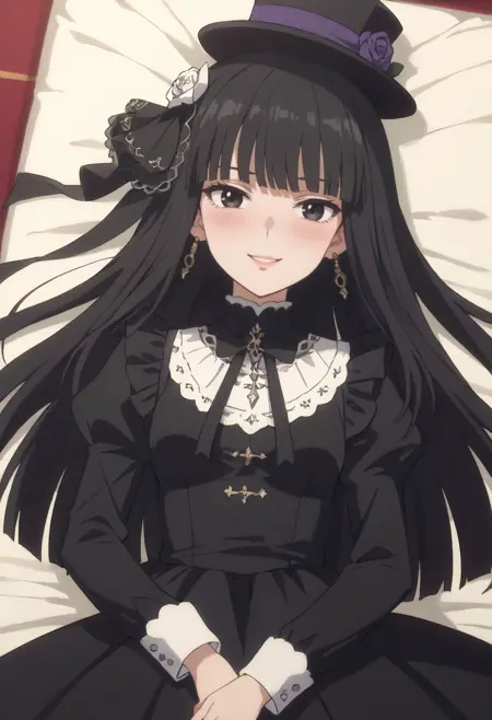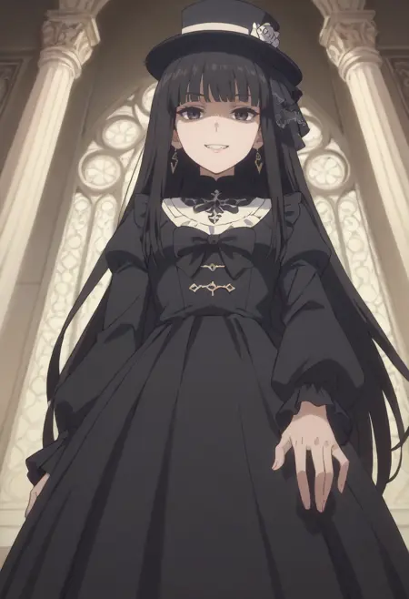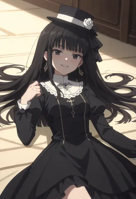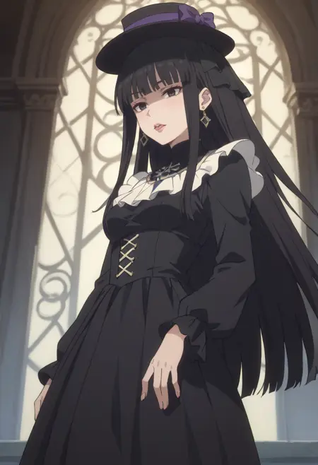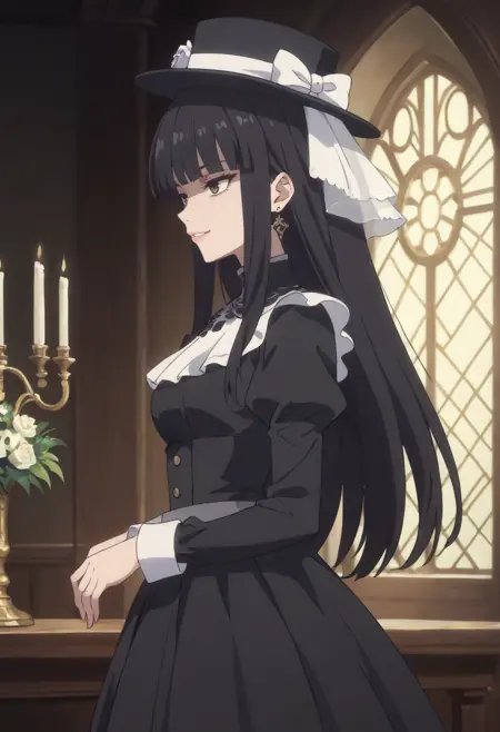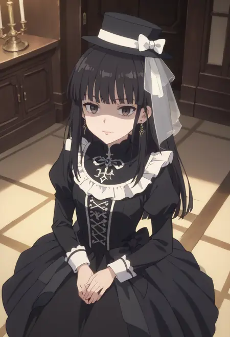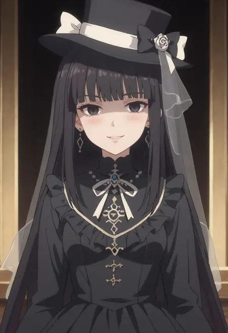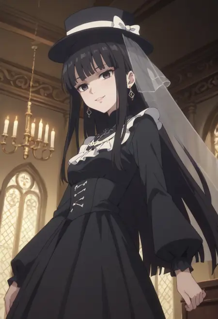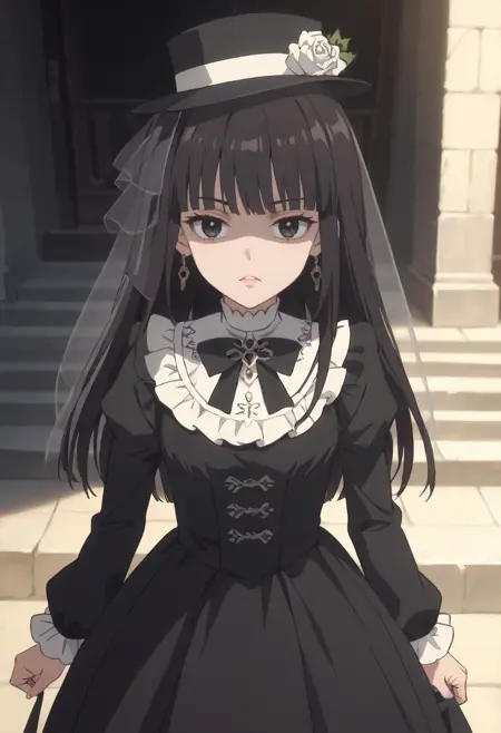 帽子、黒い頭部装飾、ドレス、リボン、長袖、イヤリング、ジュエリー、リボン、髪のリボン、黒いドレス、
