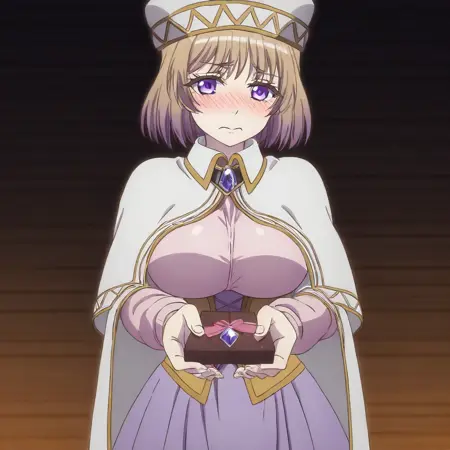 alicia edelcia \(isekai ojisan\), light brown hair, short hair, bangs, purple eyes, collar, gem, white capelet, pink and purple dress, skirt, corset, hat, heels, large breasts, 1girl, solo