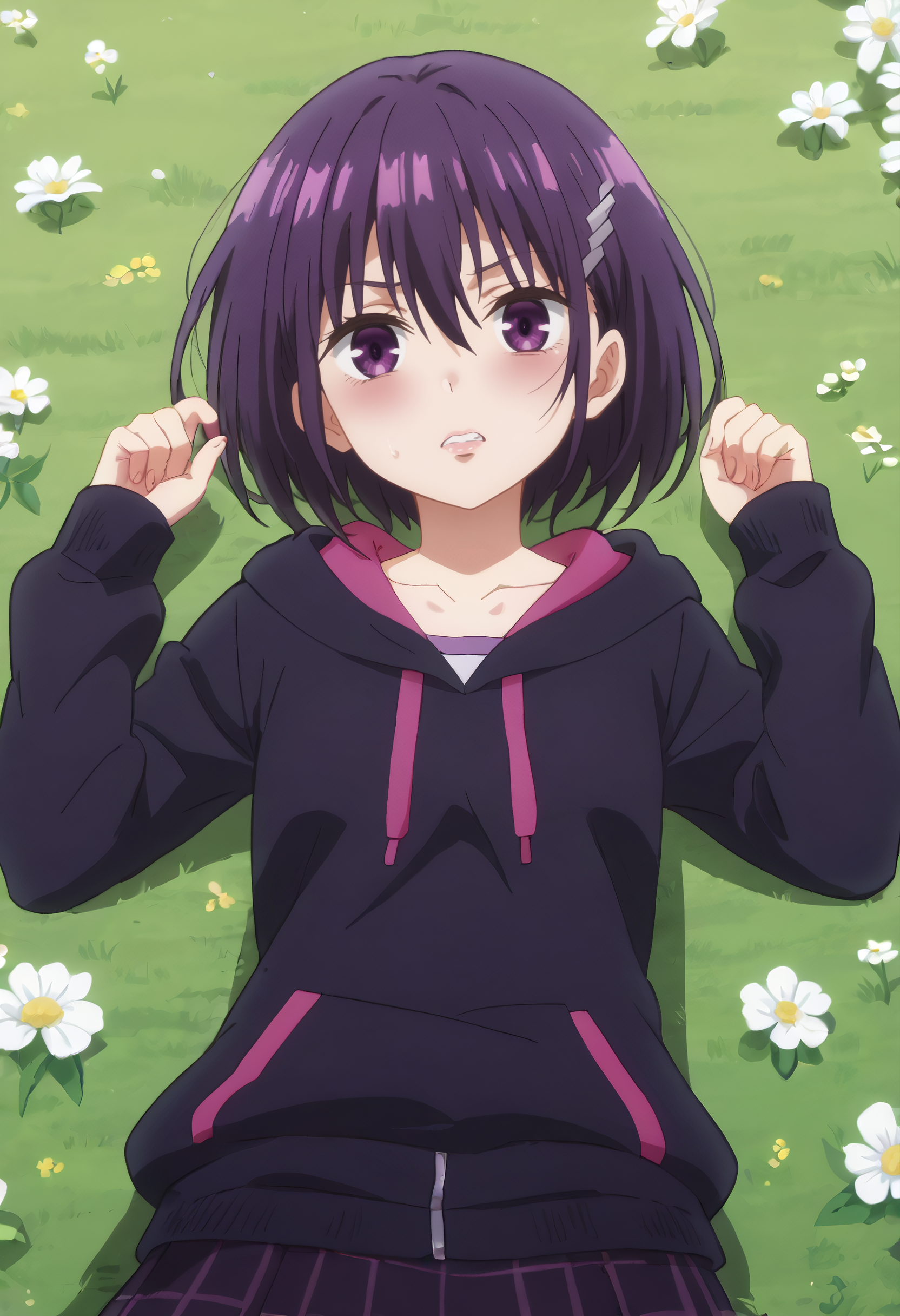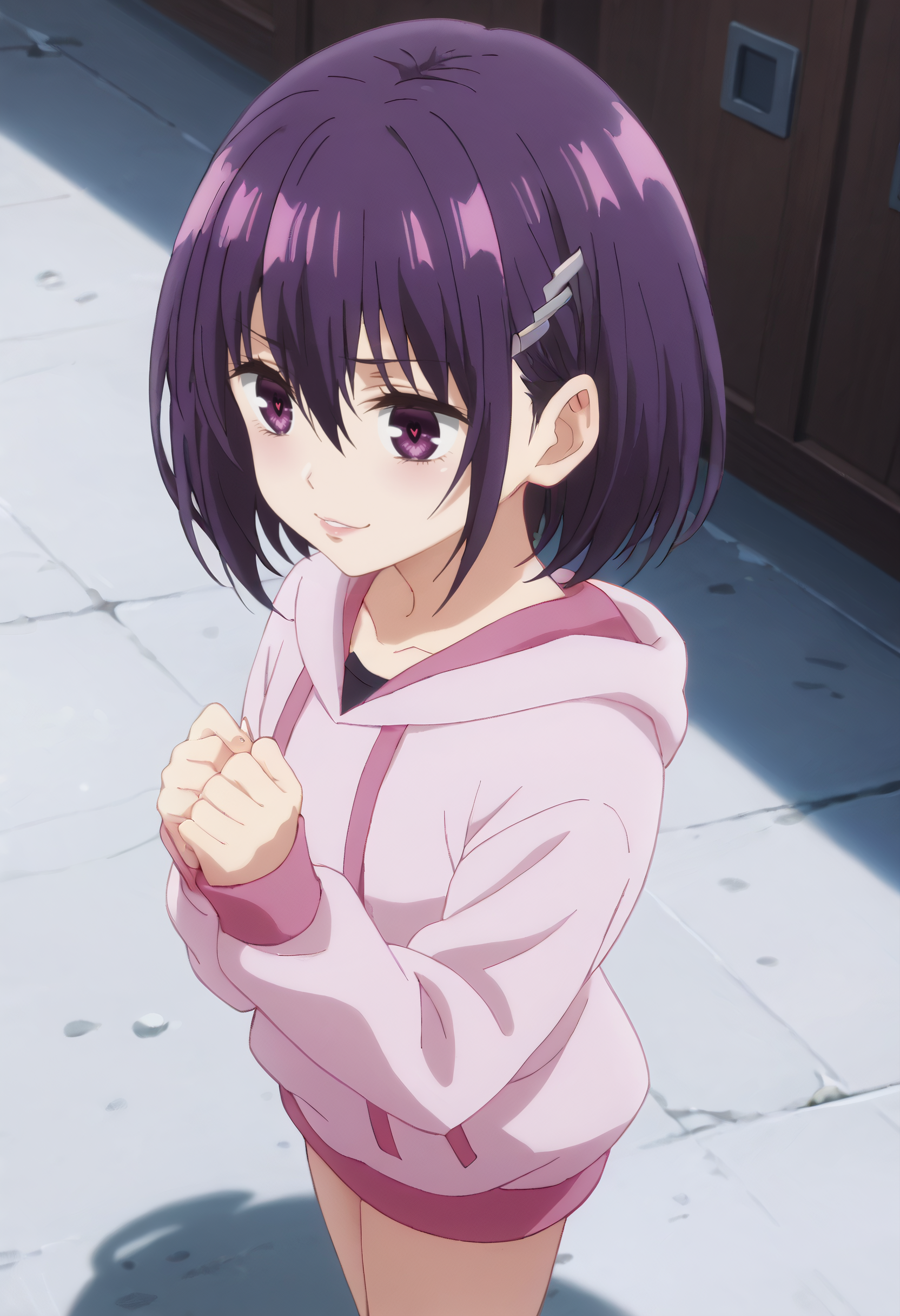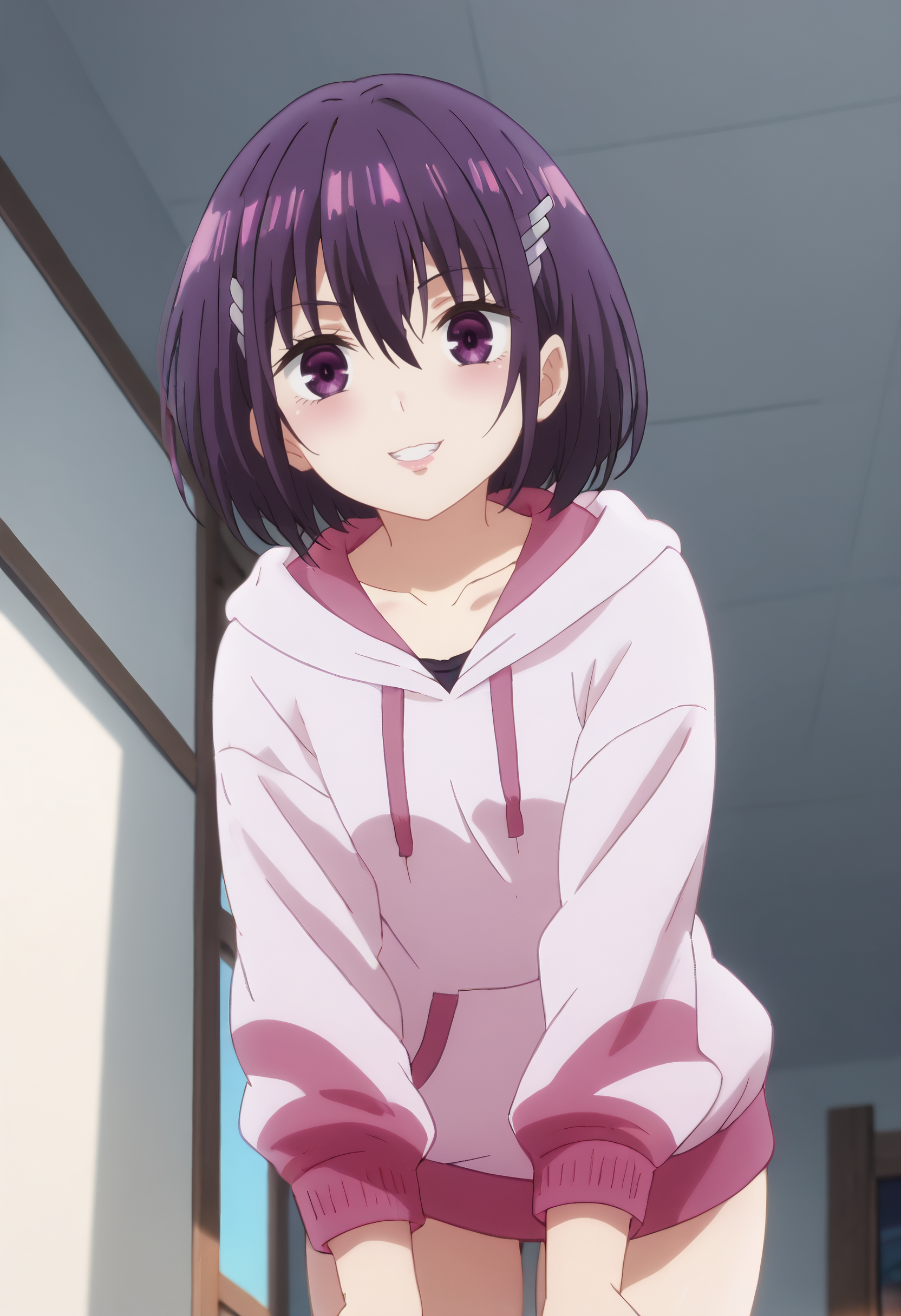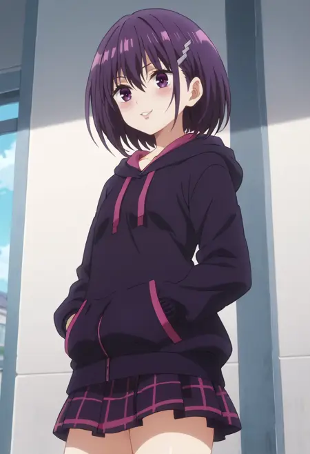 SuzuPurpleHoodie、スカート、髪飾り、フード、フーディー、長袖、フード下ろし、ヘアクリップ、チェック柄、紫のスカート、鎖骨、紫のフーディー、