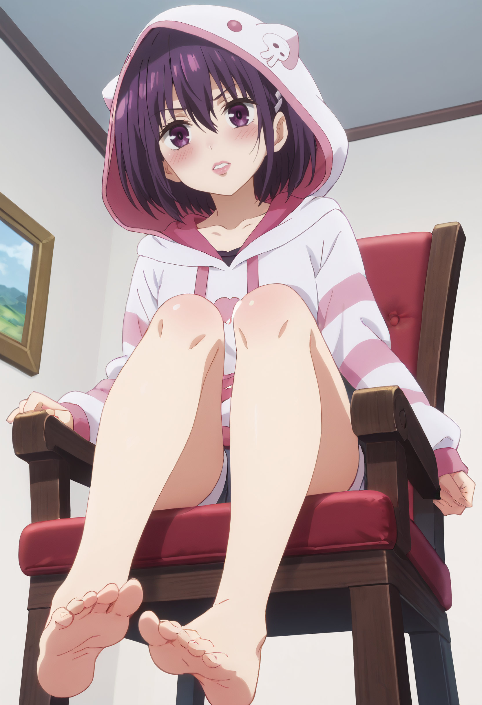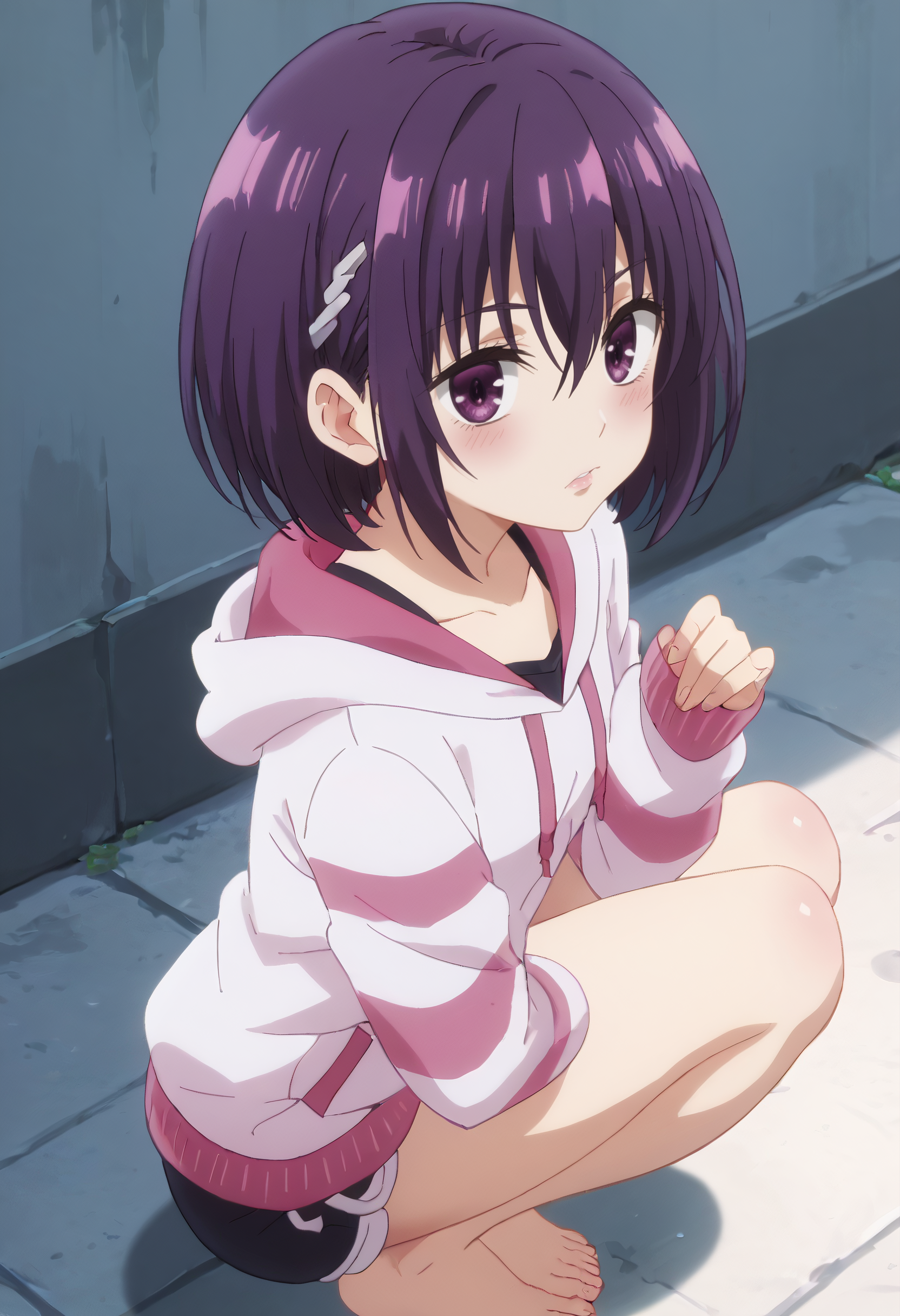 SuzuWhiteHoodie、フード、フーディー、フード下ろし、鎖骨、ピンクのフーディー、長袖、髪飾り、ヘアクリップ、素足、