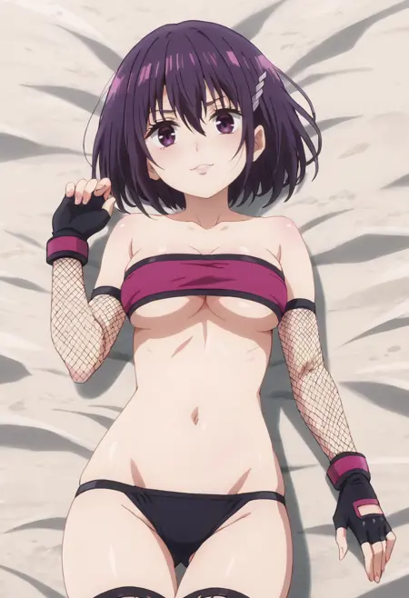 SuzuCroptop、指なし手袋、バンデウ、ピンクのバンデウ、フィッシュネットトップ、フィッシュネット、手袋、へそ、アンダーブーブ、裸の肩、黒い手袋、肘まで覆う手袋、忍者、黒いパンツ、胸元、フィッシュネット手袋、フィッシュネットレッグウェア、性器、