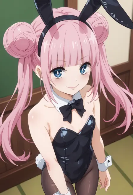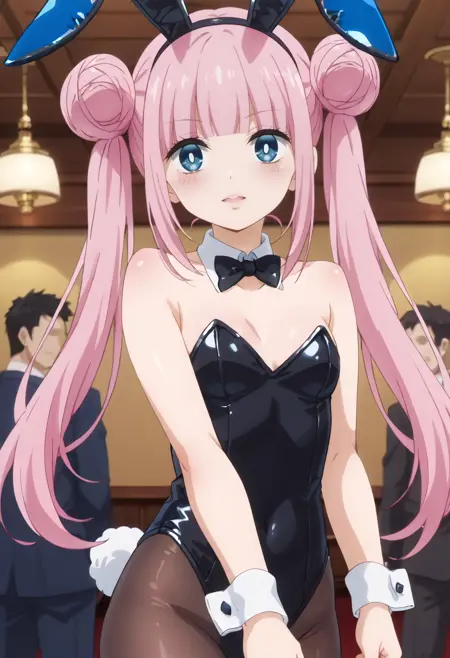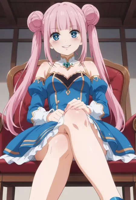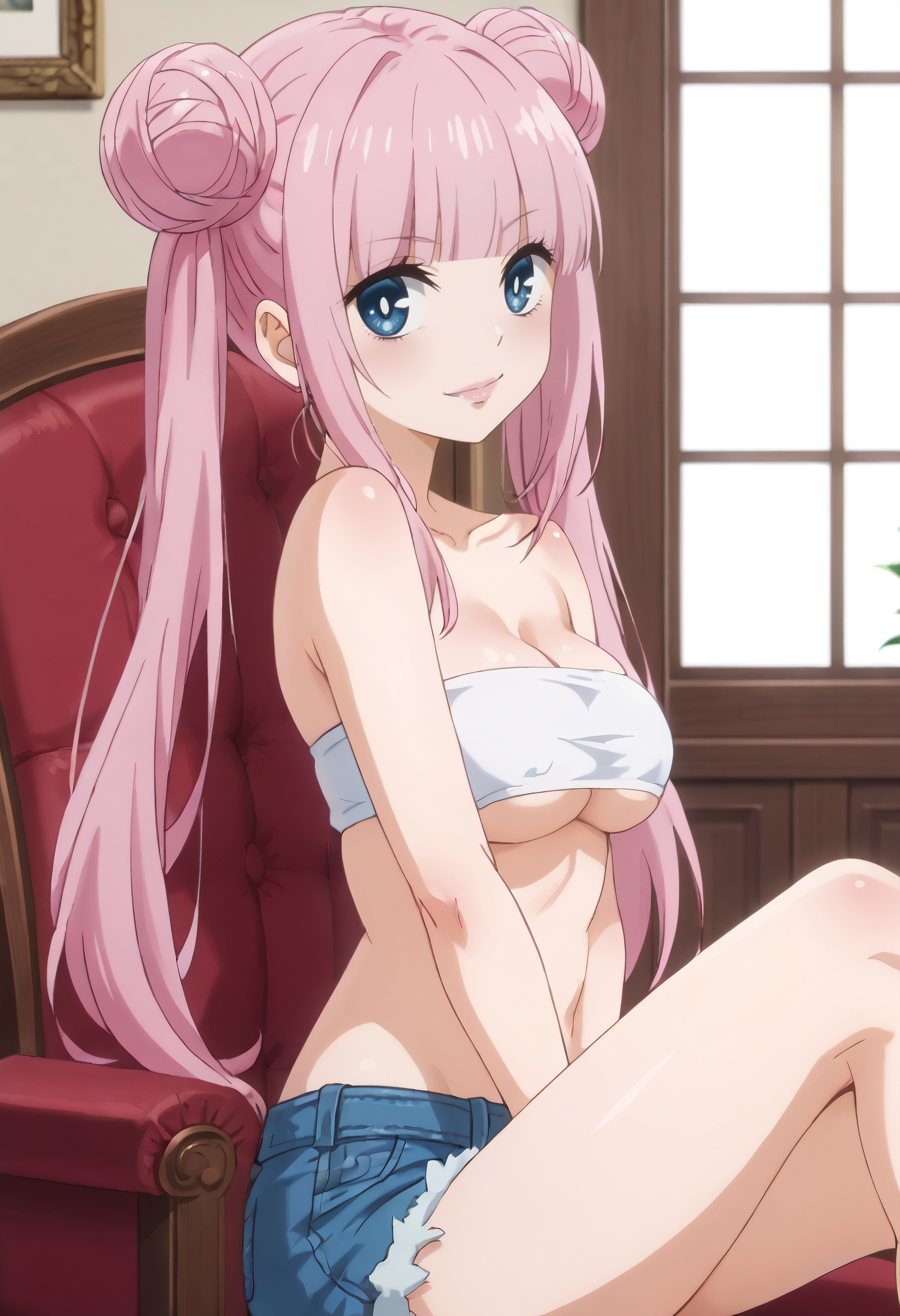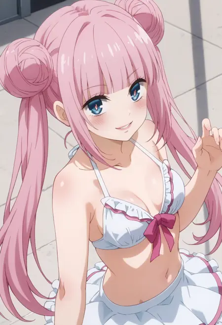 ATReo, 앞머리, 긴 머리, 분홍색 머리, 파란 눈, 머리카락을 통해 보이는 눈썹, 둔한 앞머리, 옆머리, 더블 둥, 트윈테일, 머리 둥근 모양,