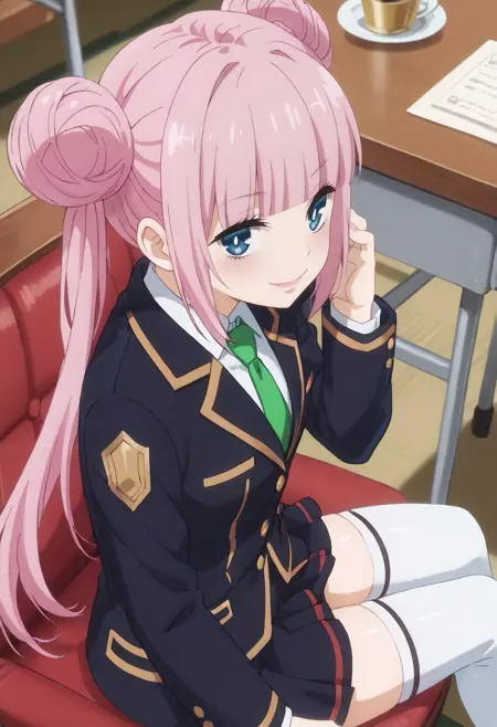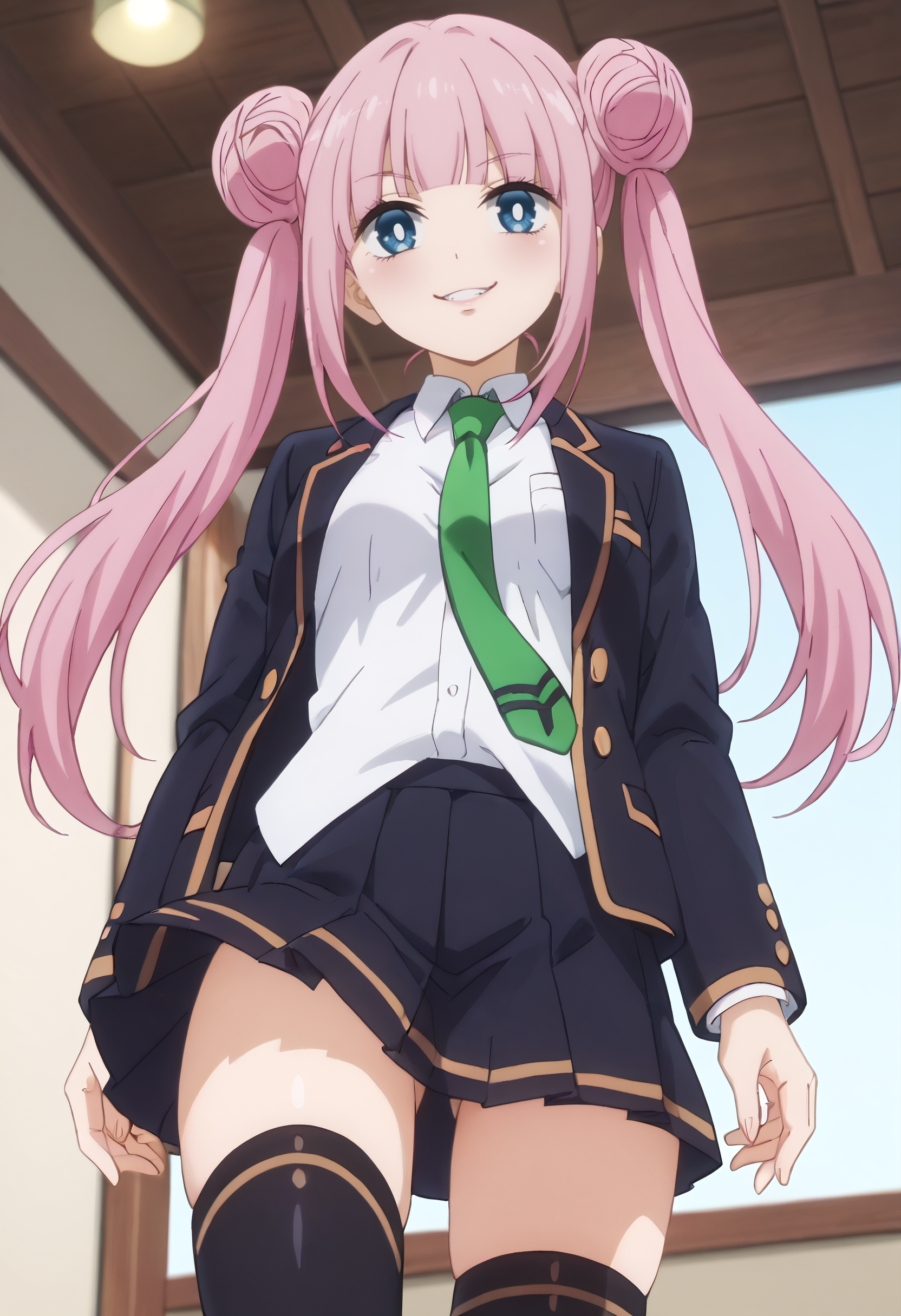 자켓, 긴 소매, 학교 교복, 셔츠, 넥타이, 흰색 셔츠, 녹색 넥타이, 블레이저, 검은 자켓, 치마, 검은 치마, 허벅지까지 긴 양말, 단추, 칼라 셔츠, 주름 치마,
