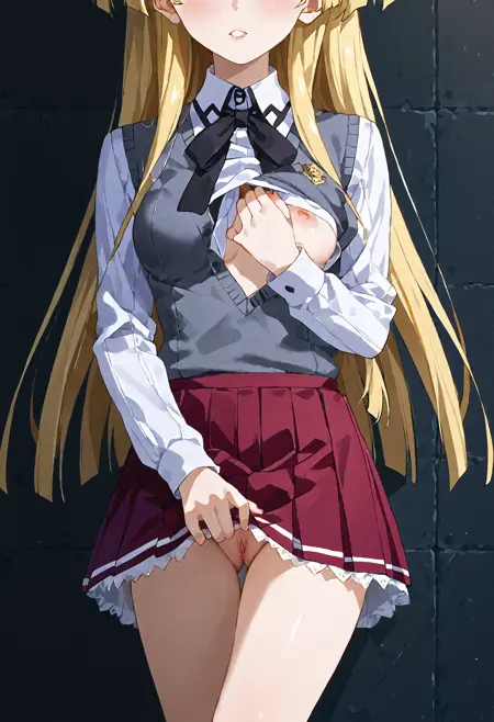 학교 복장 트리거: 스웨터 베스트, 학교 복장, 빨간 접힌 치마, 리본,