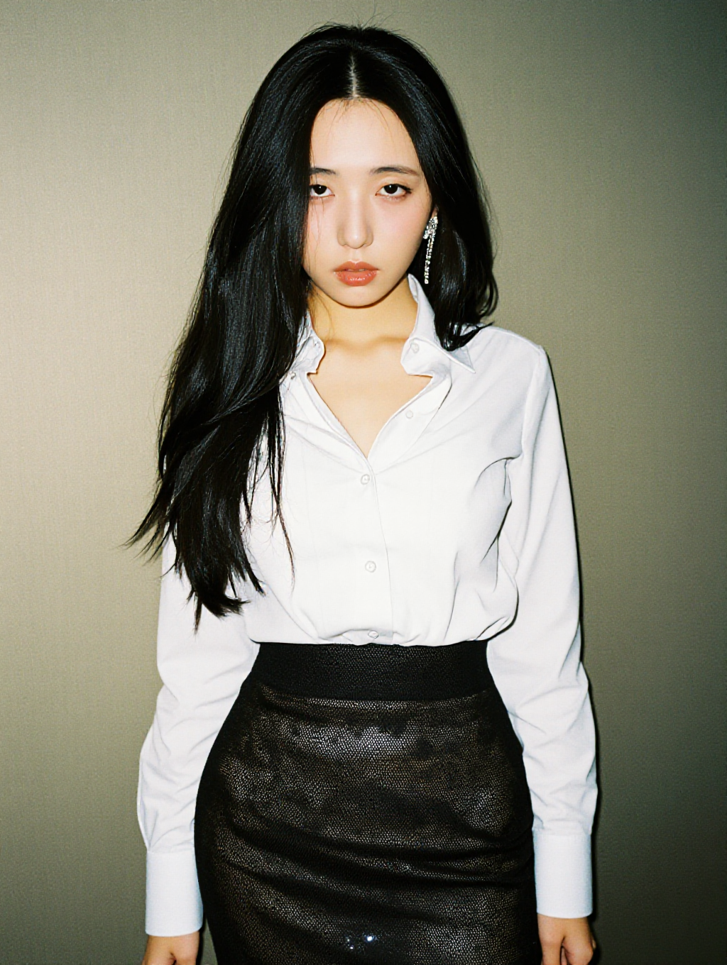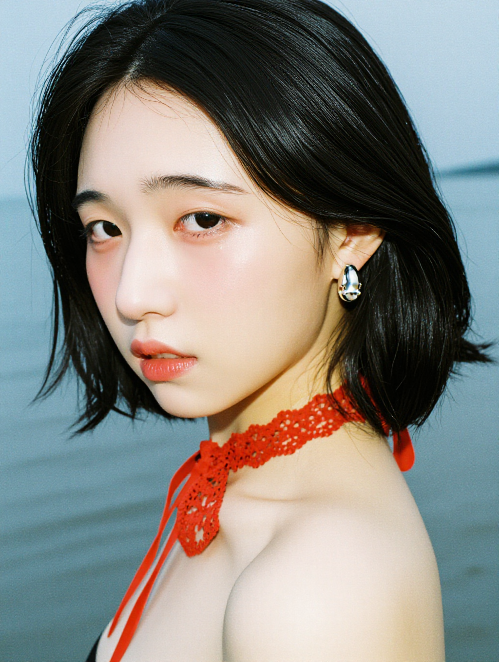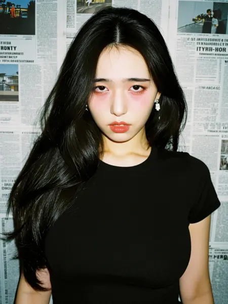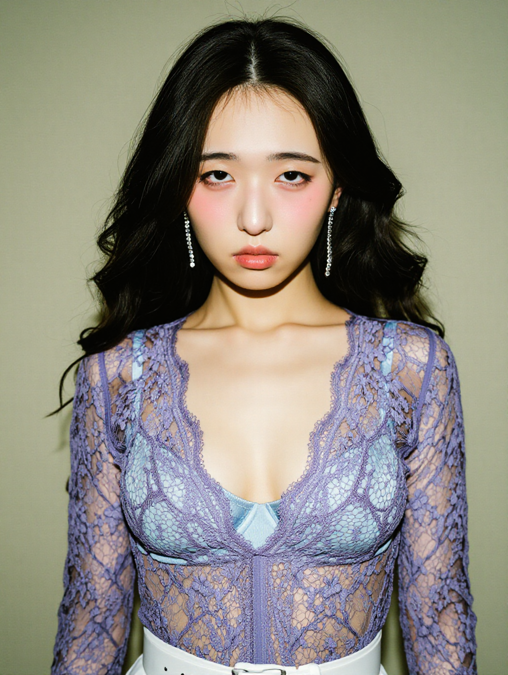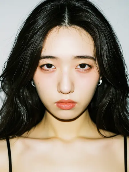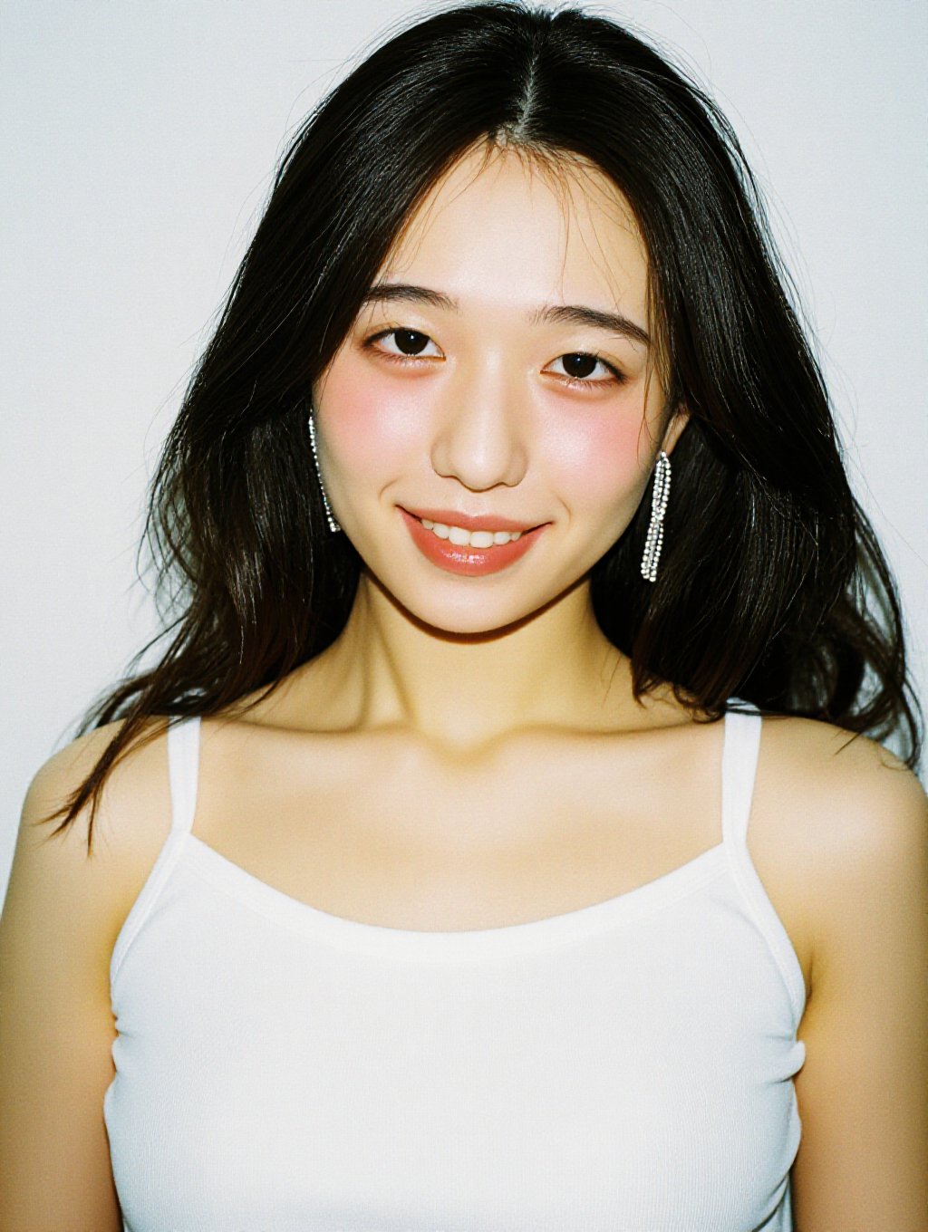 But I directly use: a high-quality film photograph of a woman's upper body, featuring black wavy hair, pink teardrop-shaped eyes, smiling at the camera, and sparkling earrings